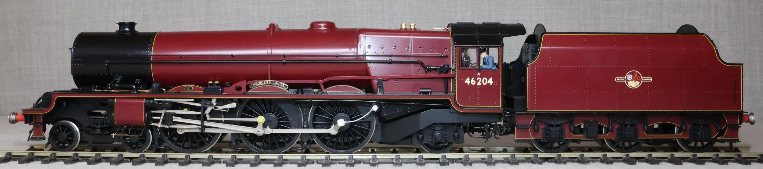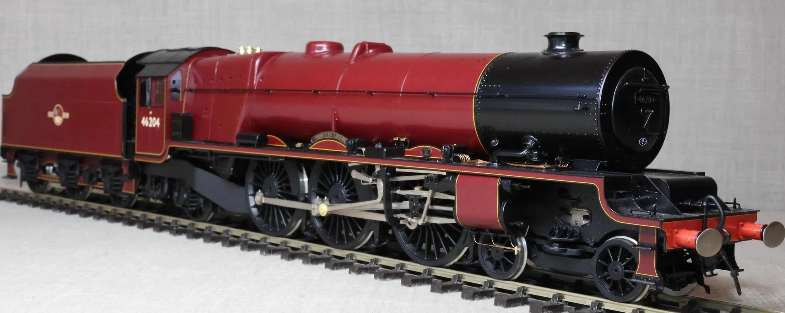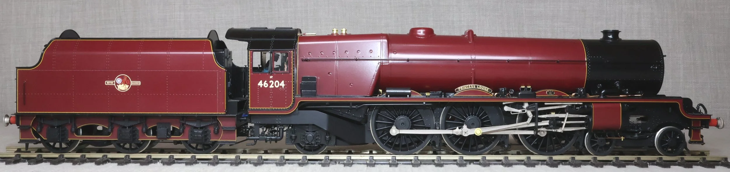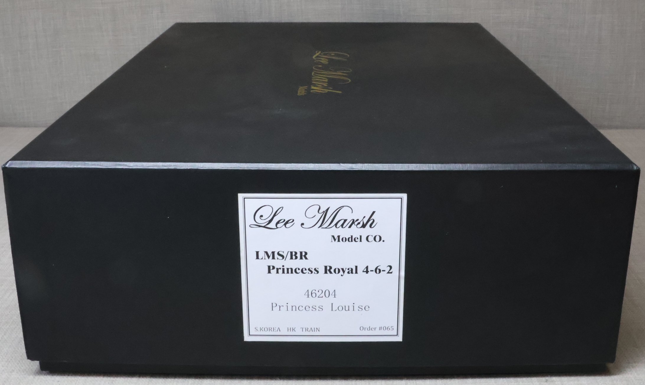 LSL96. BR ex-LMS Stanier 'Princess' Pacific 4-6-2 and Tender No. 46204 'Princess Louise'. In lined BR maroon livery with late crest and shedplate 8A Liverpool Edge Hill. Also with AWS fitted but without electrification flashes, so modelled as running in the late 1950's and very early 1960's. This is a brass model by H.K. Train of Korea for Lee Marsh Models, number 65 of a total of only 80 models produced in 2015 covering all the appropriate LMS/BR livery styles. Fitted with all the usual Lee Marsh refinements including fully working inside motion, compensated chassis (loco and tender) and superb cab detail (with crew added). Additionally fitted with DCC and sound using an ESU Loksound chip (address 6204). It will also run on DC using the supplied DCC blanking plug. The model is very lightly used and is supplied in its original box with user manual, accessories, gloves, DCC blanking plug and plinth. Due to the value, for the required insurance cover shipping is by DHL only (UK and International) at cost price. The prototype was into service from Crewe Works to Camden in July 1935 as LMS No. 6204. It became BR No. 46204 in 1948 and was withdrawn from Edge Hill in October 1961 then making its final journey to its place of birth. During its life it had 20 shed allocations excluding loan periods (Polmadie x 1, Holyhead x 1, Camden x 2, Crewe North x 7, Edge Hill x 9). RESERVED.