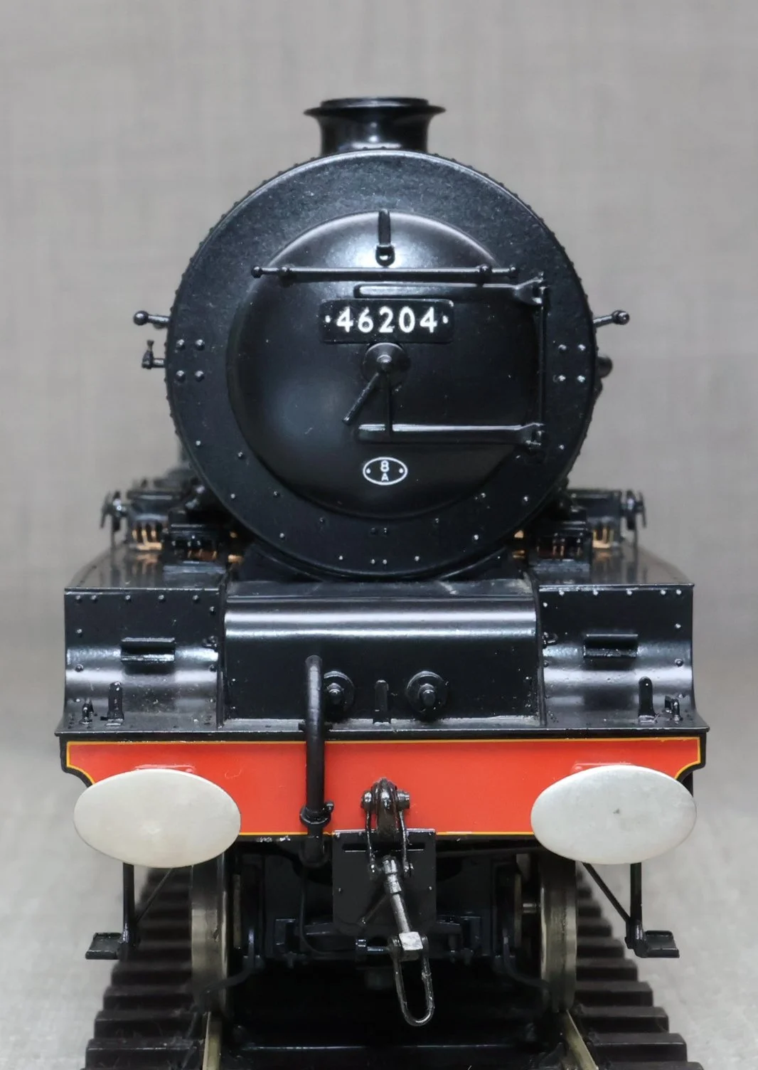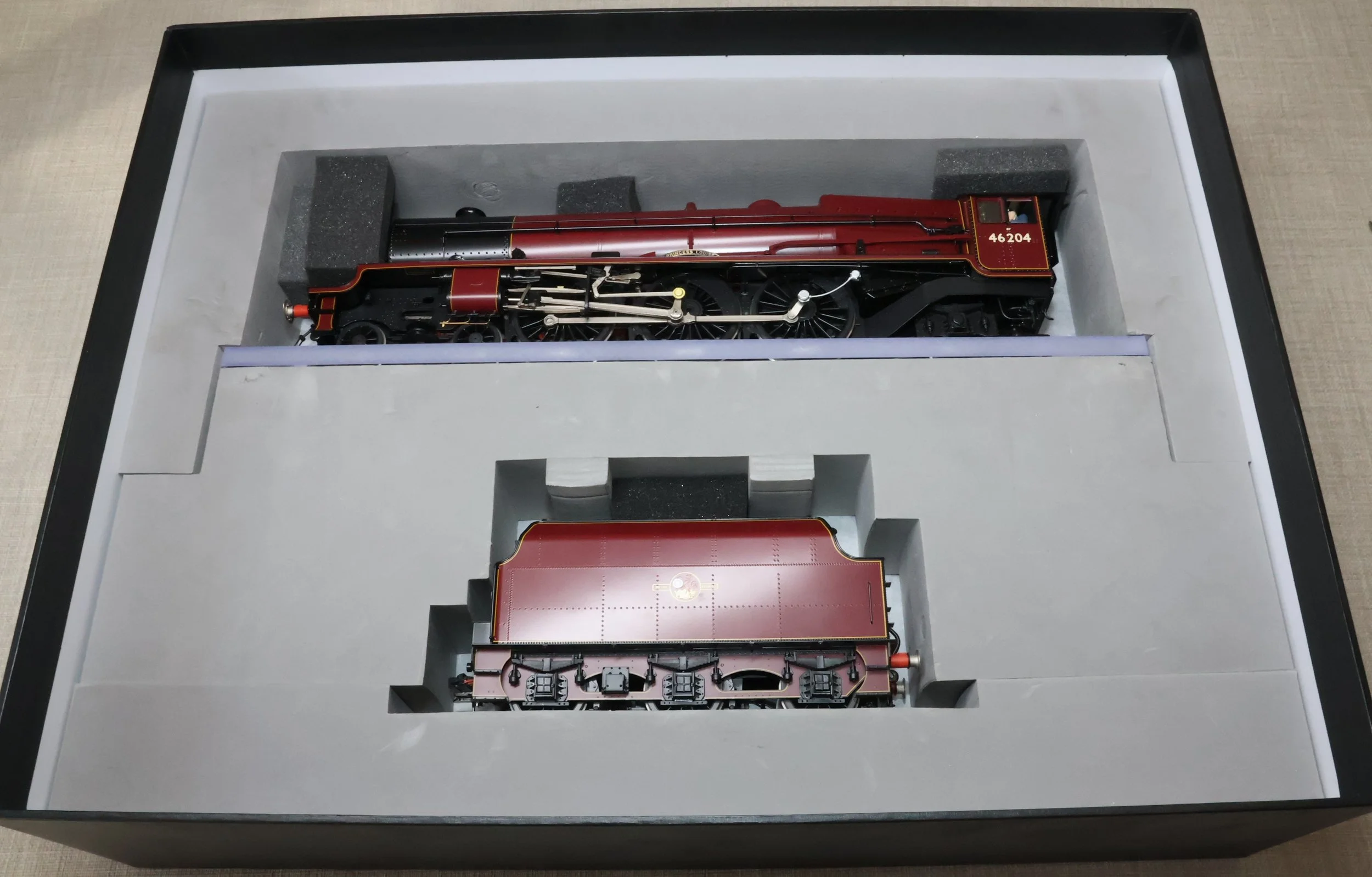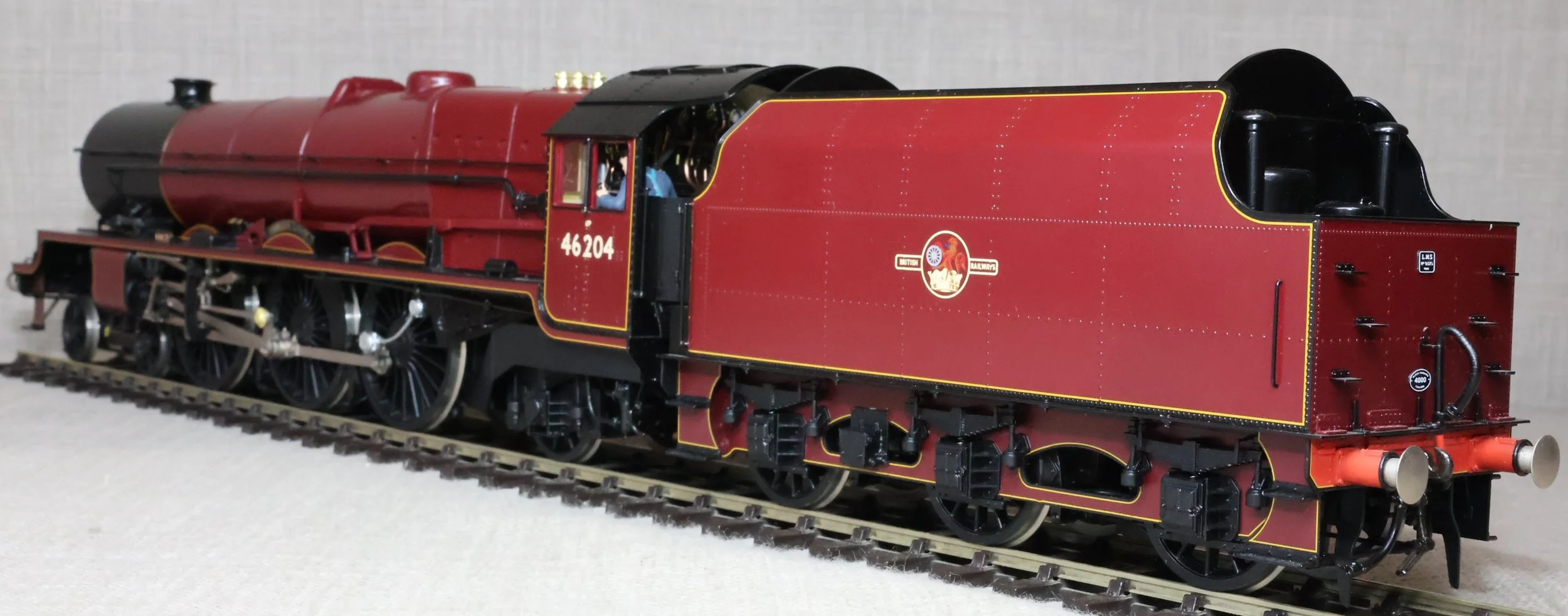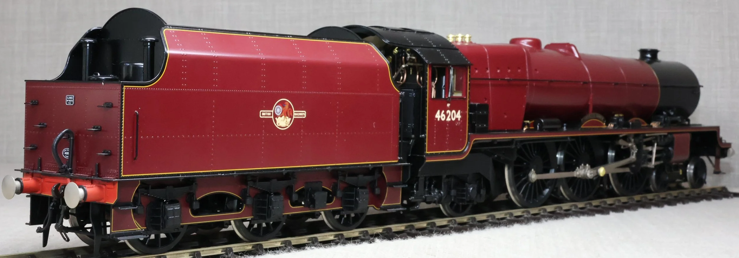 LSL96. BR ex-LMS Stanier 'Princess' Pacific 4-6-2 and Tender No. 46204 'Princess Louise'. In lined BR maroon livery with late crest and shedplate 8A Liverpool Edge Hill. Also with AWS fitted but without electrification flashes, so modelled as running in the late 1950's and very early 1960's. This is a brass model by H.K. Train of Korea for Lee Marsh Models, number 65 of a total of only 80 models produced in 2015 covering all the appropriate LMS/BR livery styles. Fitted with all the usual Lee Marsh refinements including fully working inside motion, compensated chassis (loco and tender) and superb cab detail (with crew added). Additionally fitted with DCC and sound using an ESU Loksound chip (address 6204). It will also run on DC using the supplied DCC blanking plug. The model is very lightly used and is supplied in its original box with user manual, accessories, gloves, DCC blanking plug and plinth. Due to the value, for the required insurance cover shipping is by DHL only (UK and International) at cost price. The prototype was into service from Crewe Works to Camden in July 1935 as LMS No. 6204. It became BR No. 46204 in 1948 and was withdrawn from Edge Hill in October 1961 then making its final journey to its place of birth. During its life it had 20 shed allocations excluding loan periods (Polmadie x 1, Holyhead x 1, Camden x 2, Crewe North x 7, Edge Hill x 9). RESERVED.