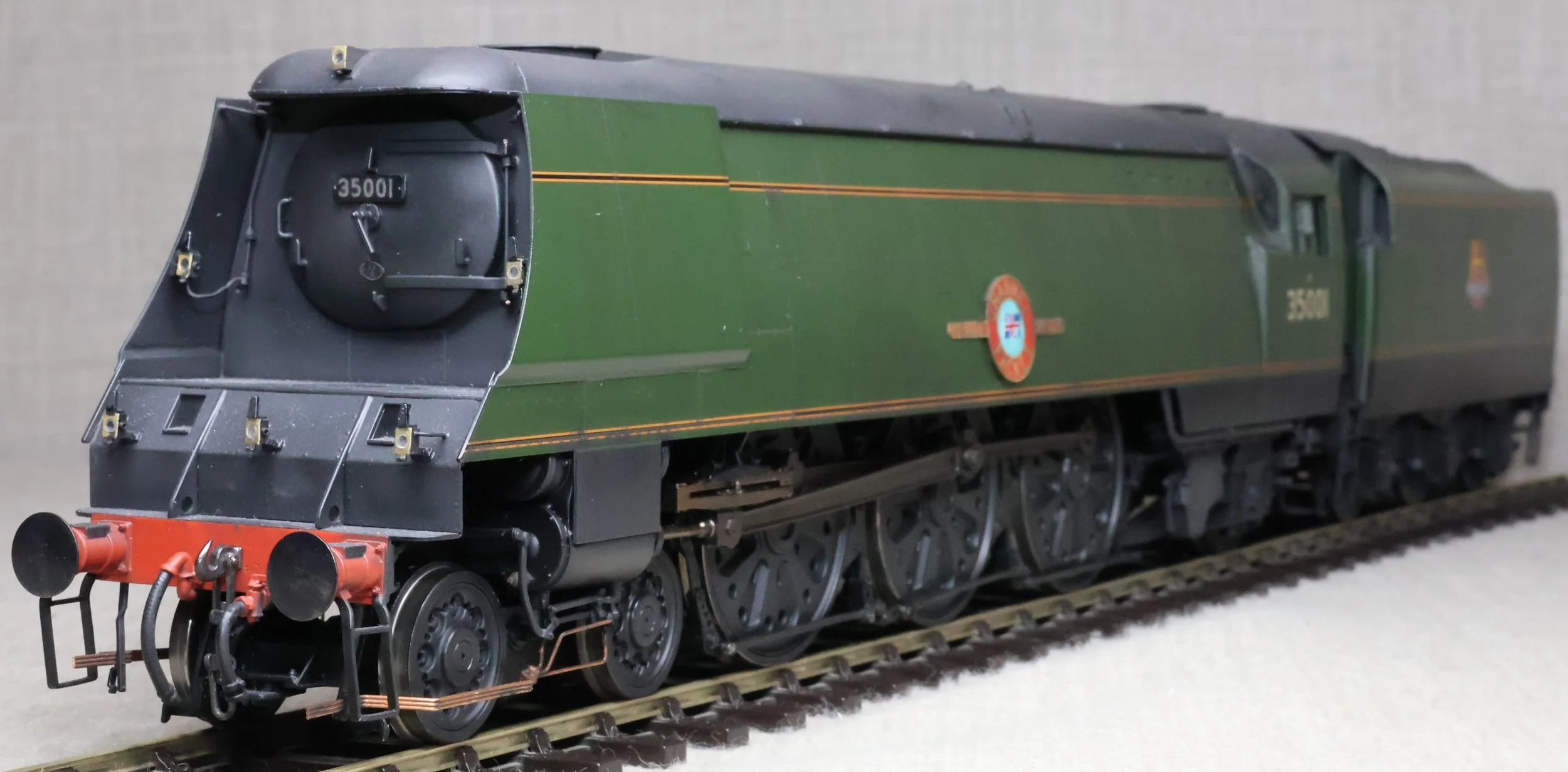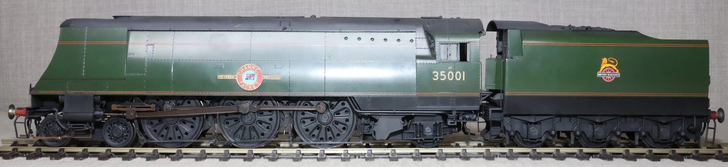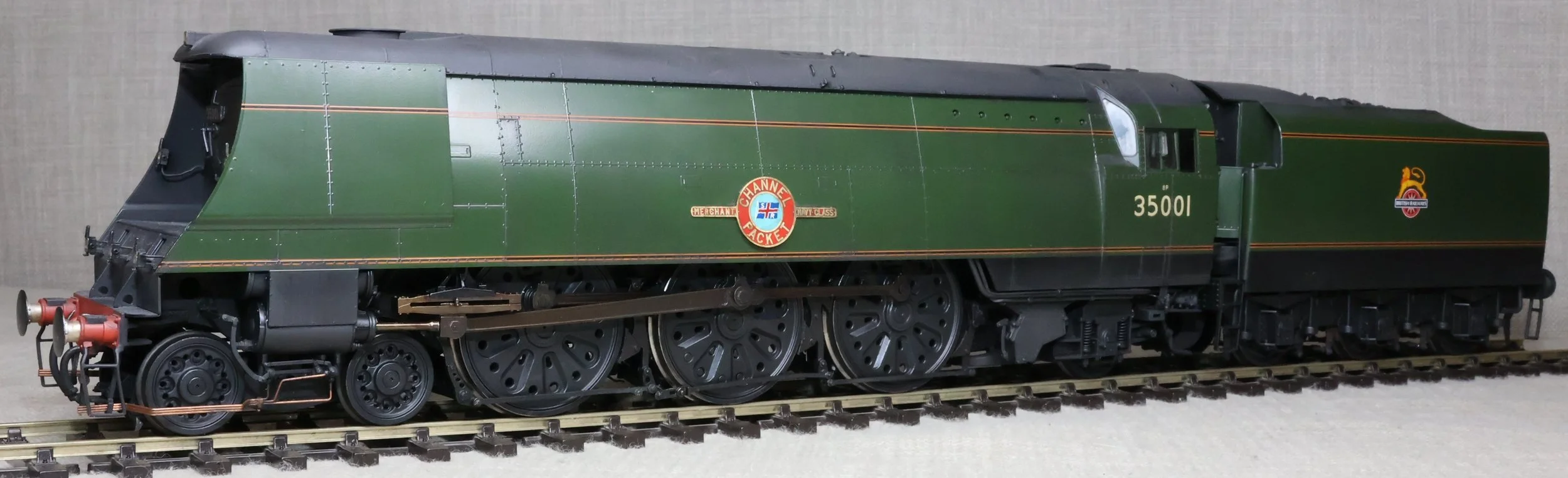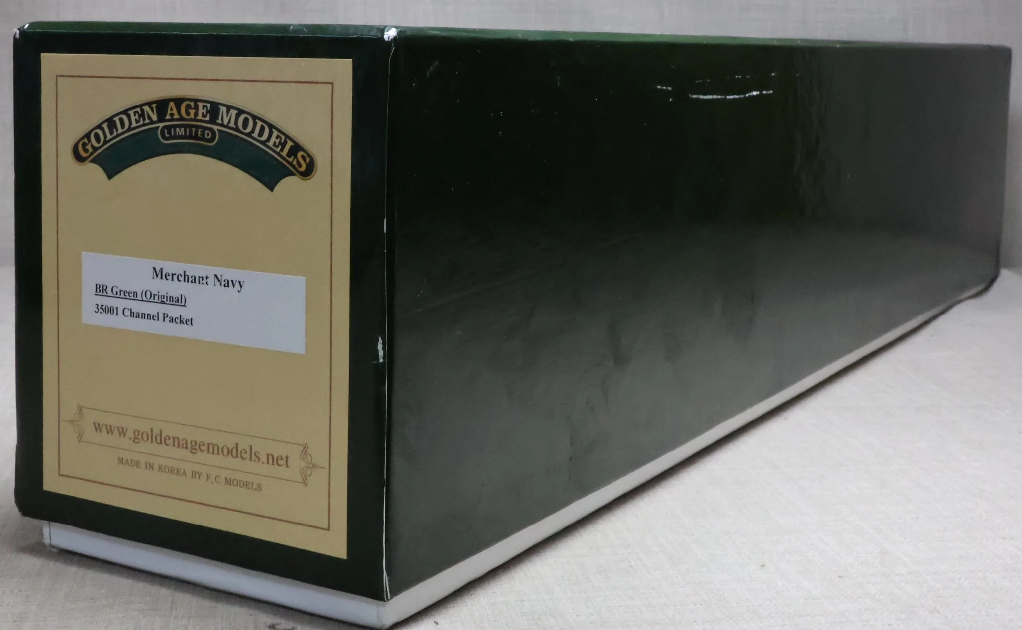 LTSY01. BR ex-Southern Railway Unrebuilt Bulleid Merchant Navy Pacific and Tender No. 35001 ‘Channel Packet’. In lined BR green with early crest and shedplate 72A Exmouth Junction. The black paintwork (cab roof, boiler, smokebox, underframe detail and tender top) is lightly weathered. This is a brass model by F.C. Models of Korea for Golden Age Models, one of a Limited Edition of approximately 120 Bulleid Merchant Navy Pacifics which sold out many years ago. With a very high level of detail including working inside motion, a German motor by Faulhaber which has excellent pulling power, and with superb cab detail. Additionally, factory fitted with DCC and sound using an ESU Loksound V4 chip (address 5001) by South West Digital. It will also run on DC using the DCC/DC changeover switch underneath the cab. The model is lightly used and is supplied in its original inner and outer boxes with Golden Age and South West Digital paperwork, also with a detachable 'Atlantic Coast Express' headboard. This is a very heavy model which requires minimum 6ft radius curves. Due to the value and the box length, delivery (UK and International) is by DHL courier only, fully insured, at cost price. The prototype 35001 entered service from Eastleigh Works in June 1941 as No. 21C1, renumbered to No. 35001 in 1949. It was rebuilt at Eastleigh in August 1959 and was withdrawn from Bournemouth shed in November 1964 having spent only the previous two months there. Longer term allocations were at Exmouth Junction (probably from new until 1957) then Stewarts Lane (1957-1959) and Nine Elms (1959 until September 1964). SOLD.