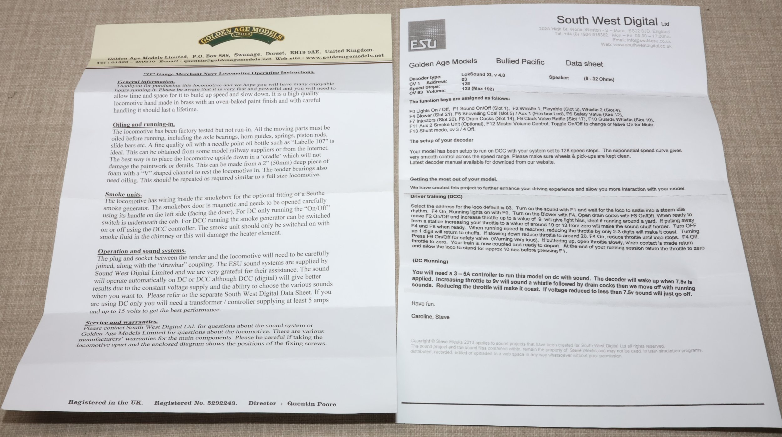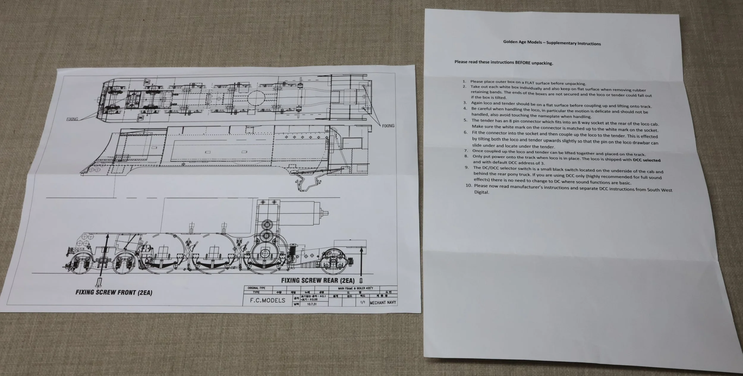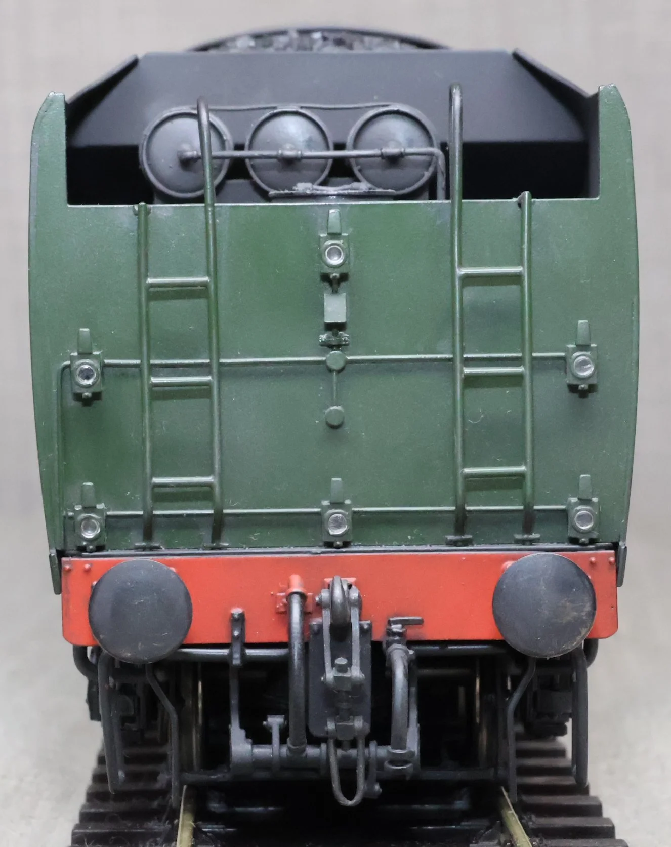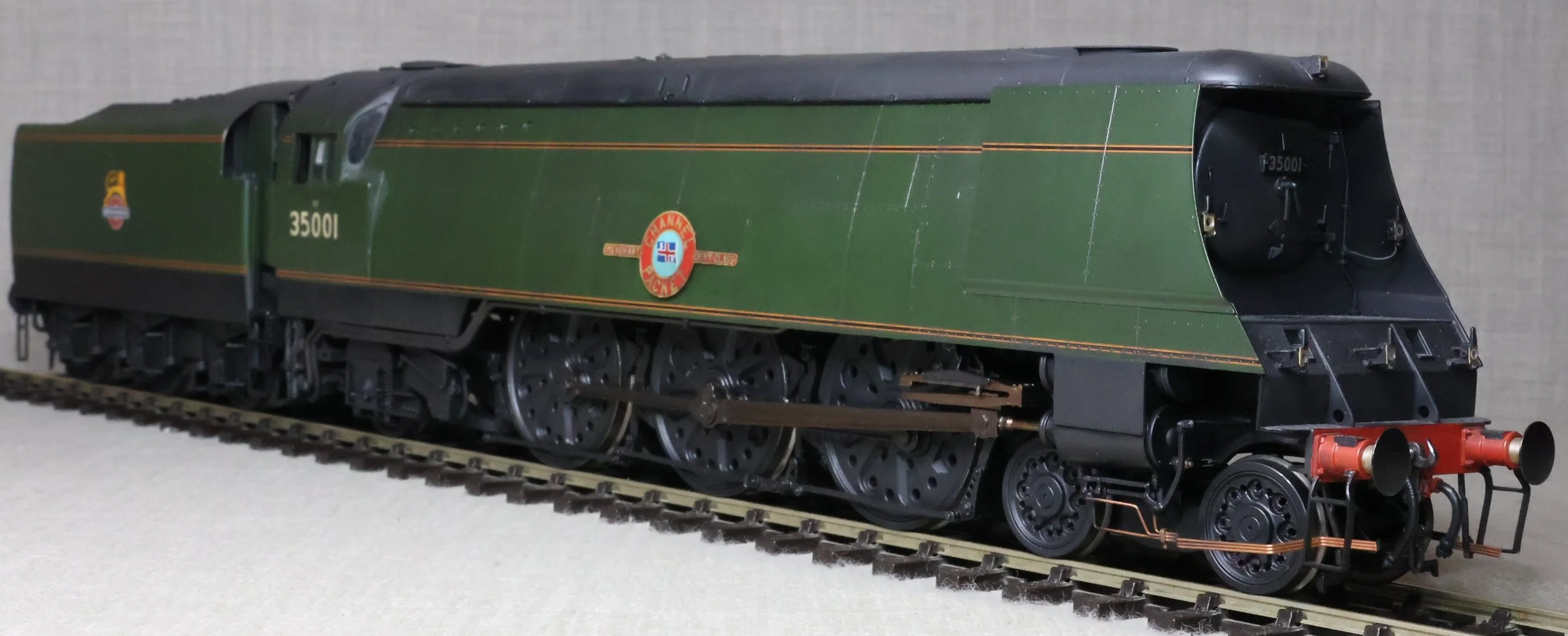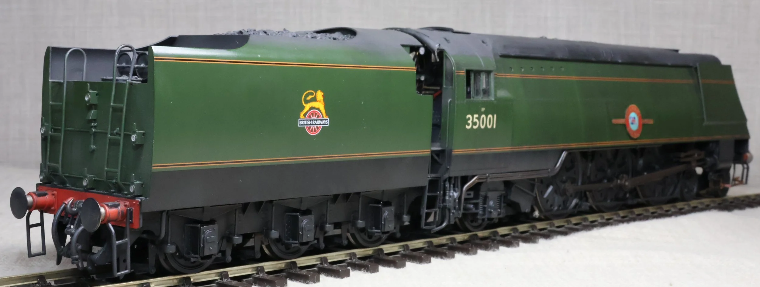 LTSY01. BR ex-Southern Railway Unrebuilt Bulleid Merchant Navy Pacific and Tender No. 35001 ‘Channel Packet’. In lined BR green with early crest and shedplate 72A Exmouth Junction. The black paintwork (cab roof, boiler, smokebox, underframe detail and tender top) is lightly weathered. This is a brass model by F.C. Models of Korea for Golden Age Models, one of a Limited Edition of approximately 120 Bulleid Merchant Navy Pacifics which sold out many years ago. With a very high level of detail including working inside motion, a German motor by Faulhaber which has excellent pulling power, and with superb cab detail. Additionally, factory fitted with DCC and sound using an ESU Loksound V4 chip (address 5001) by South West Digital. It will also run on DC using the DCC/DC changeover switch underneath the cab. The model is lightly used and is supplied in its original inner and outer boxes with Golden Age and South West Digital paperwork, also with a detachable 'Atlantic Coast Express' headboard. This is a very heavy model which requires minimum 6ft radius curves. Due to the value and the box length, delivery (UK and International) is by DHL courier only, fully insured, at cost price. The prototype 35001 entered service from Eastleigh Works in June 1941 as No. 21C1, renumbered to No. 35001 in 1949. It was rebuilt at Eastleigh in August 1959 and was withdrawn from Bournemouth shed in November 1964 having spent only the previous two months there. Longer term allocations were at Exmouth Junction (probably from new until 1957) then Stewarts Lane (1957-1959) and Nine Elms (1959 until September 1964). SOLD.