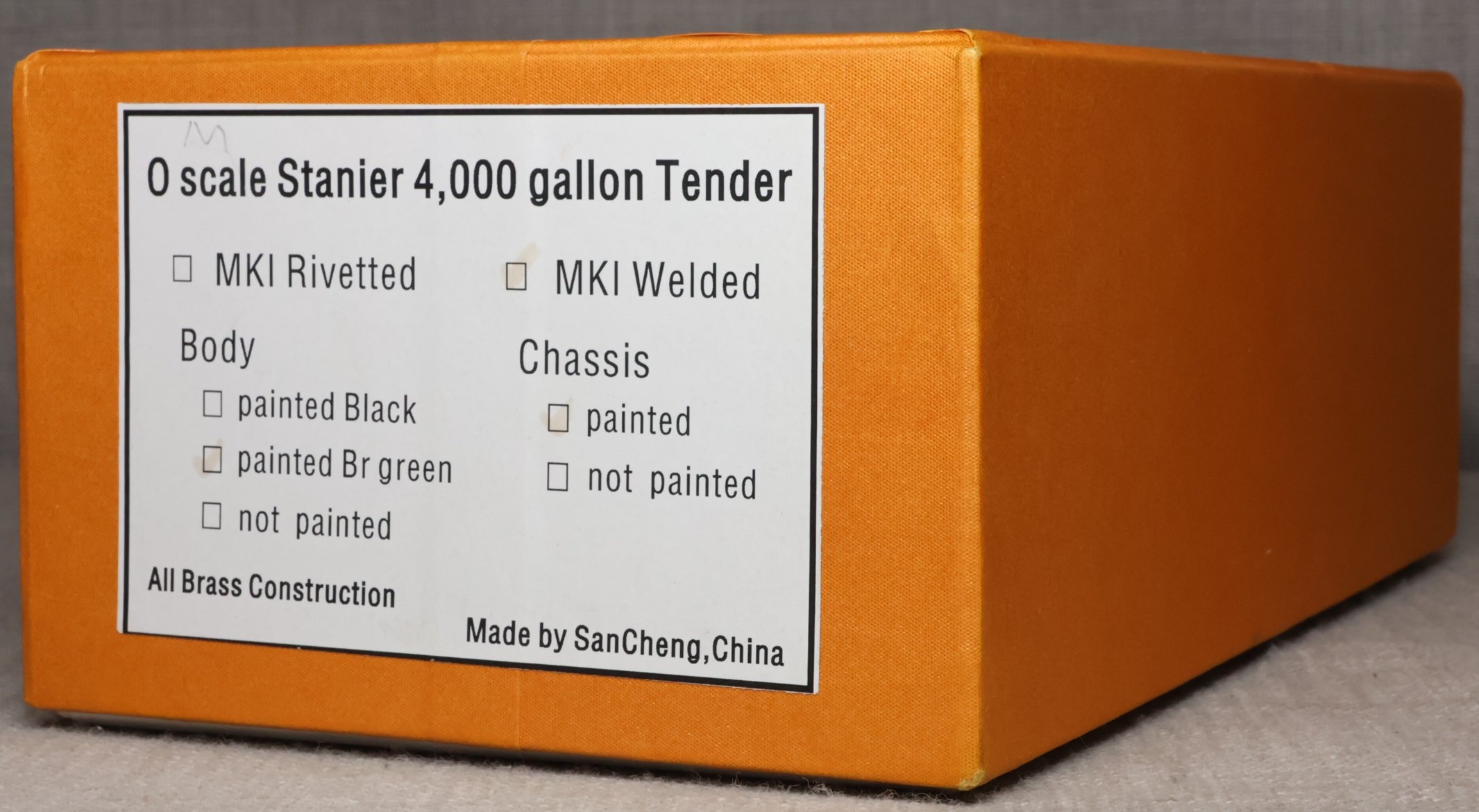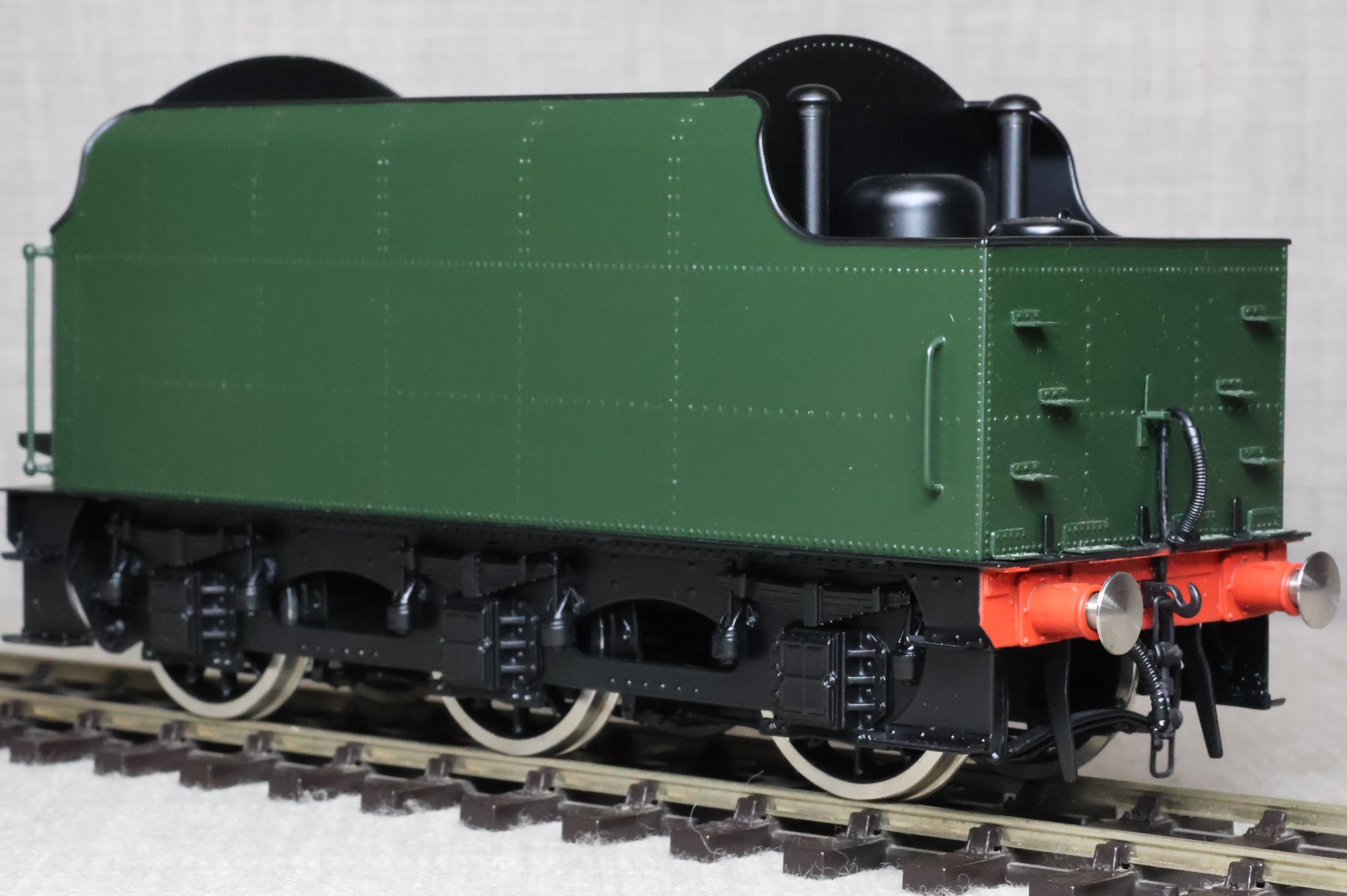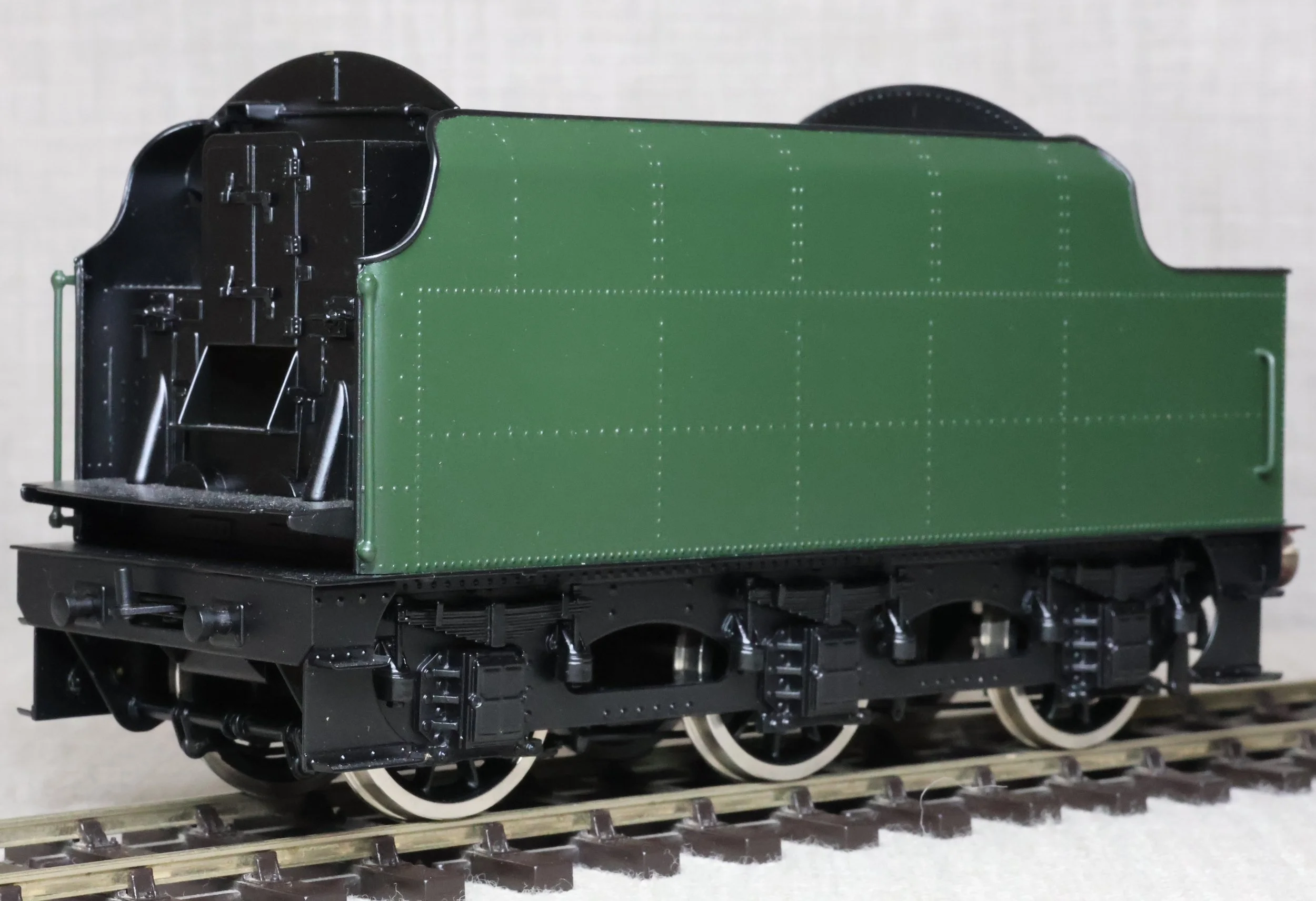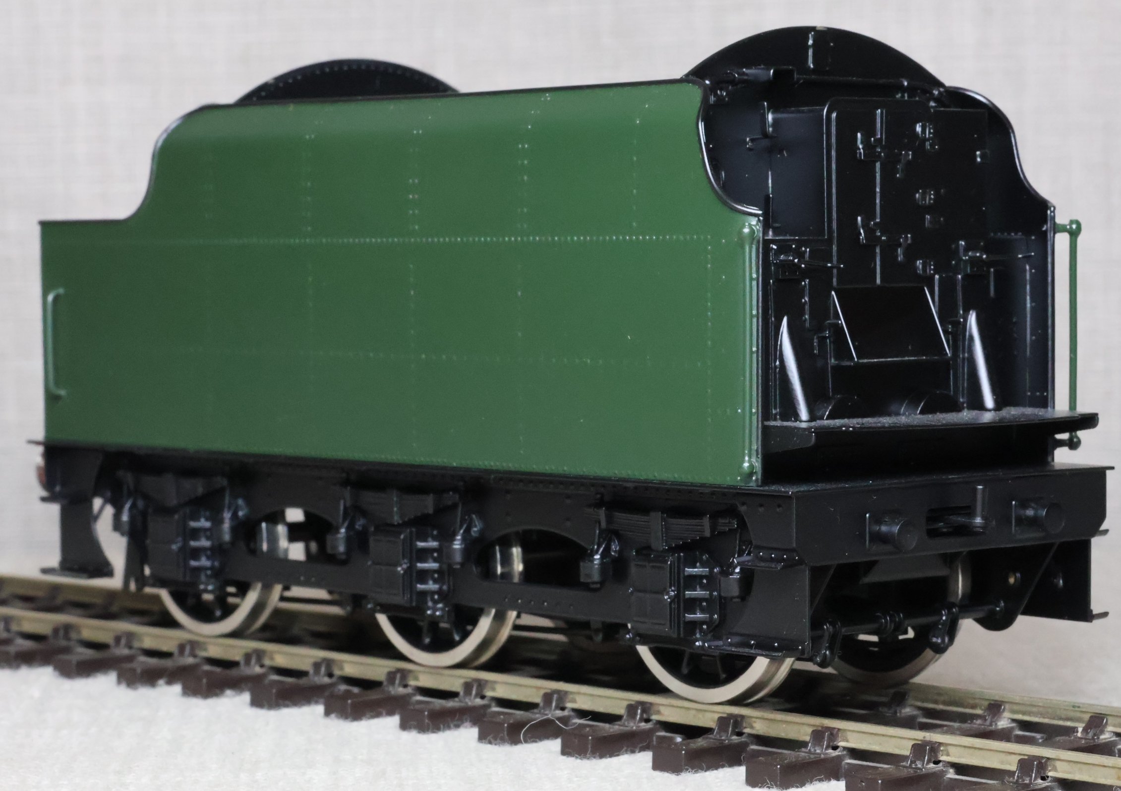 MSL12. BR Stanier 4000 Gallon Tender, Rivetted Type in BR Green with Black Chassis. This is a brass model by Sancheng for Finescale Brass, is unused, and is supplied in its original Finescale Brass box. Suitable for a BR Jubilee, Patriot or Royal Scot. £250.
