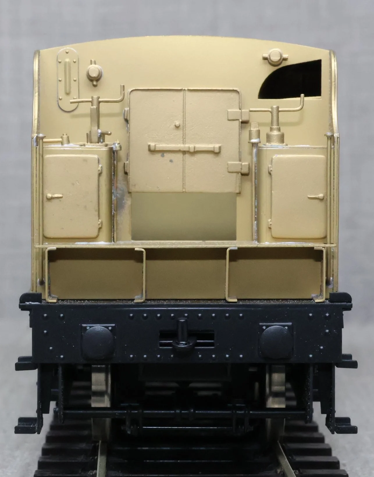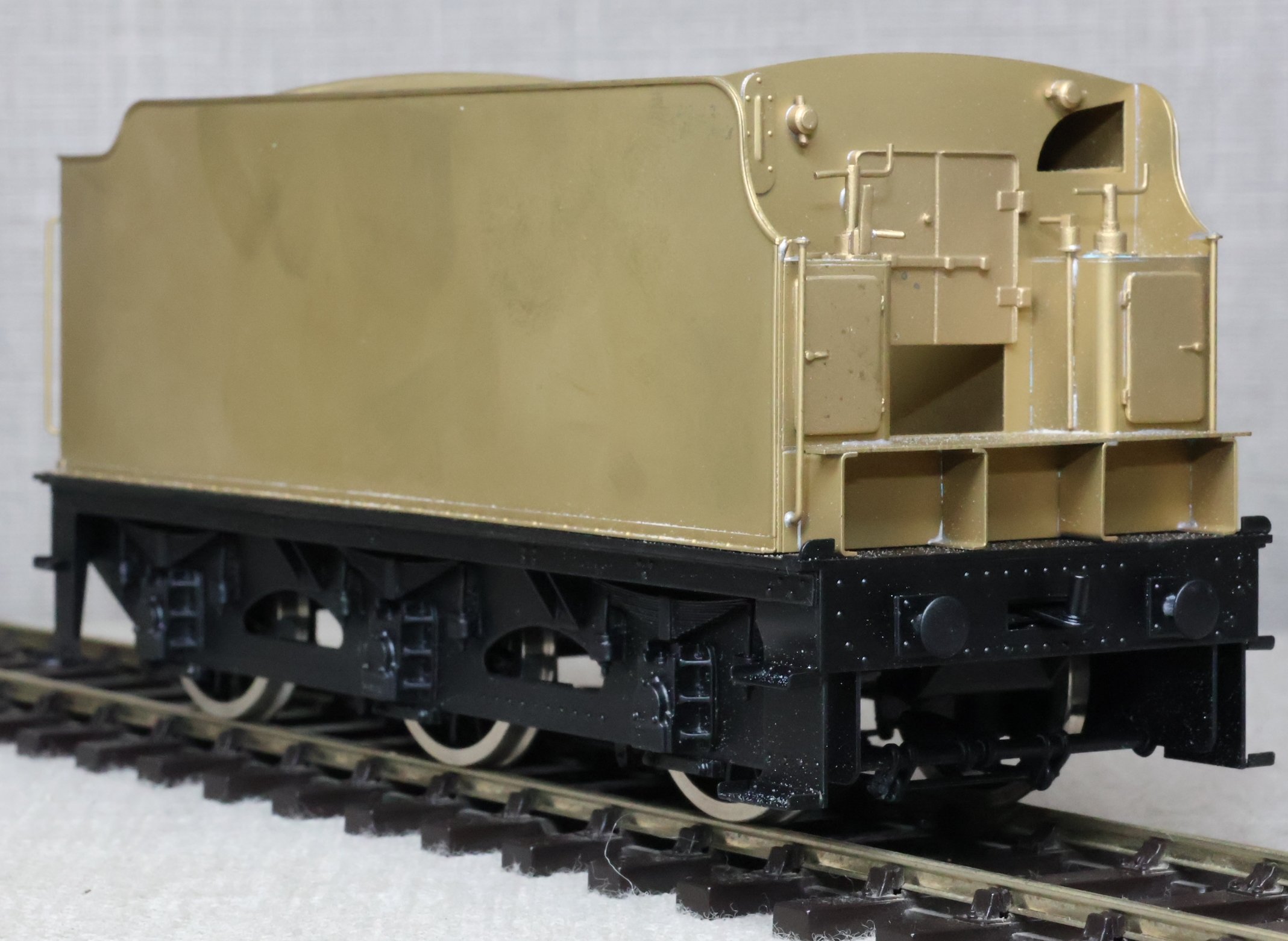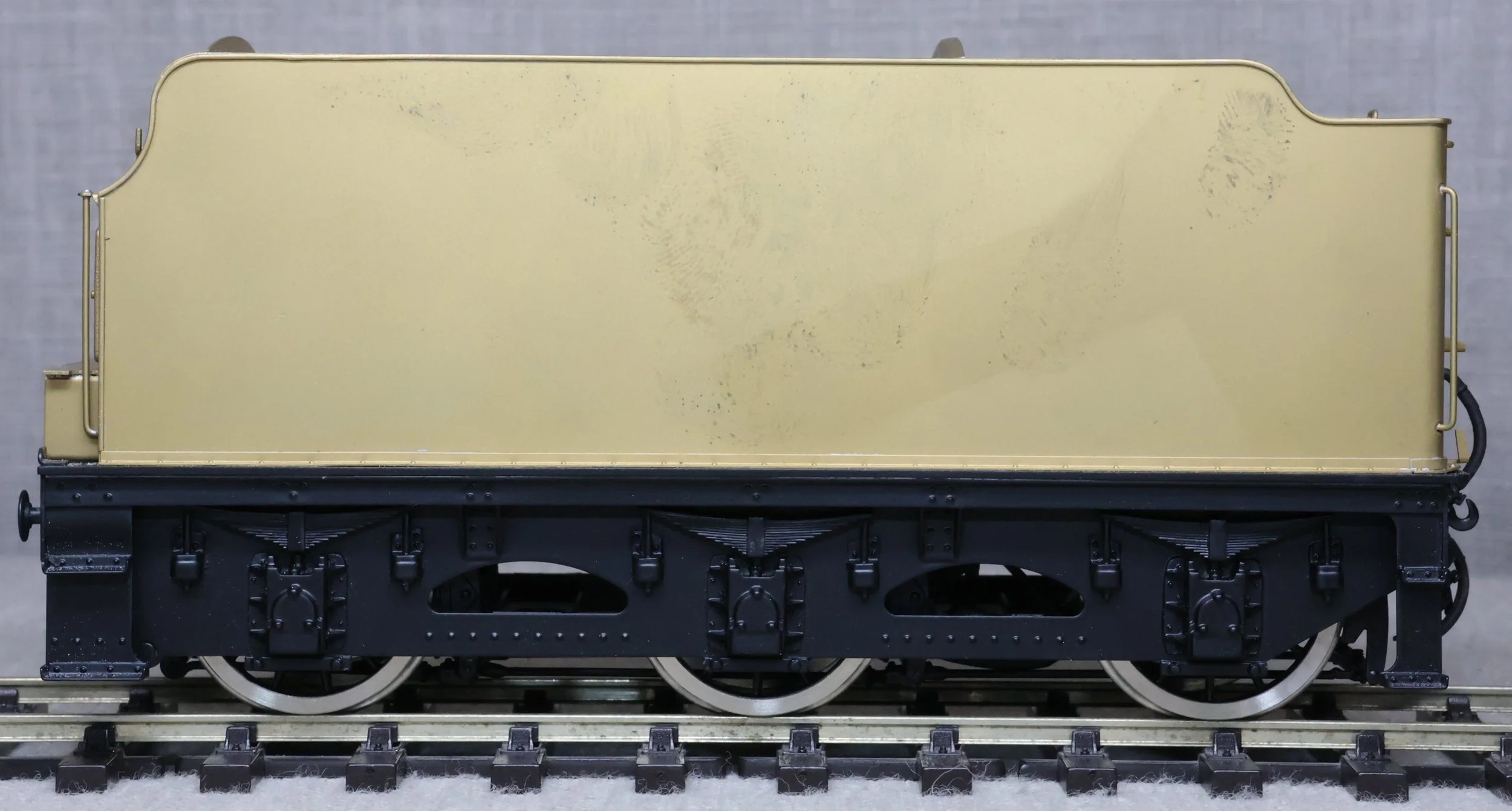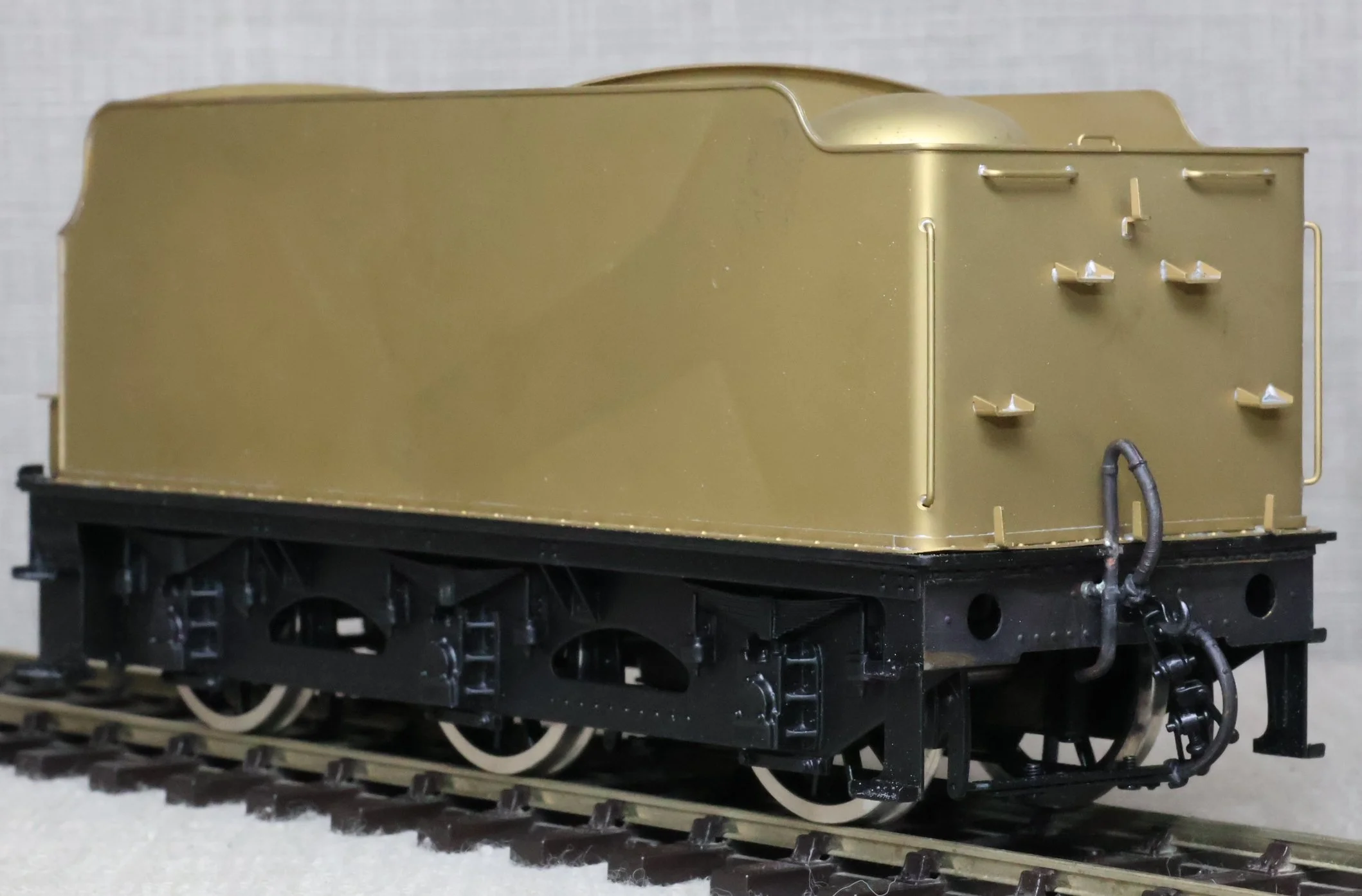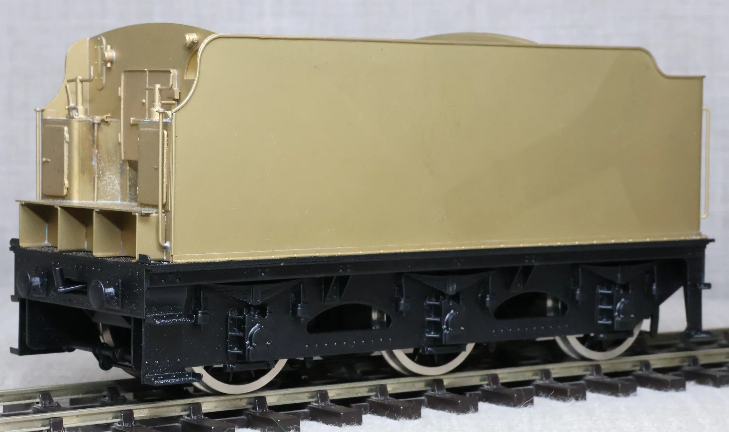 MSL15. GWR/BR Hawksworth 4000 Gallon Tender in Plain Brass with Black Chassis. This is a brass model by Sancheng for Finescale Brass, is unused, and is supplied in an original, plain Finescale Brass box. Note that the sprung buffers are supplied but have never been fitted. Hawksworth tenders were first produced for the 'County' 4-6-0 class (30 tenders) with later examples built for 'Halls' and 'Castles' (107 tenders). There was a 6 inch width difference between the slightly wider 'County' tenders and the later 'Castle/Hall' tenders but I believe that only one type was produced by Sancheng - the later type (as Sancheng did not model the 'County' 4-6-0 loco). £300.