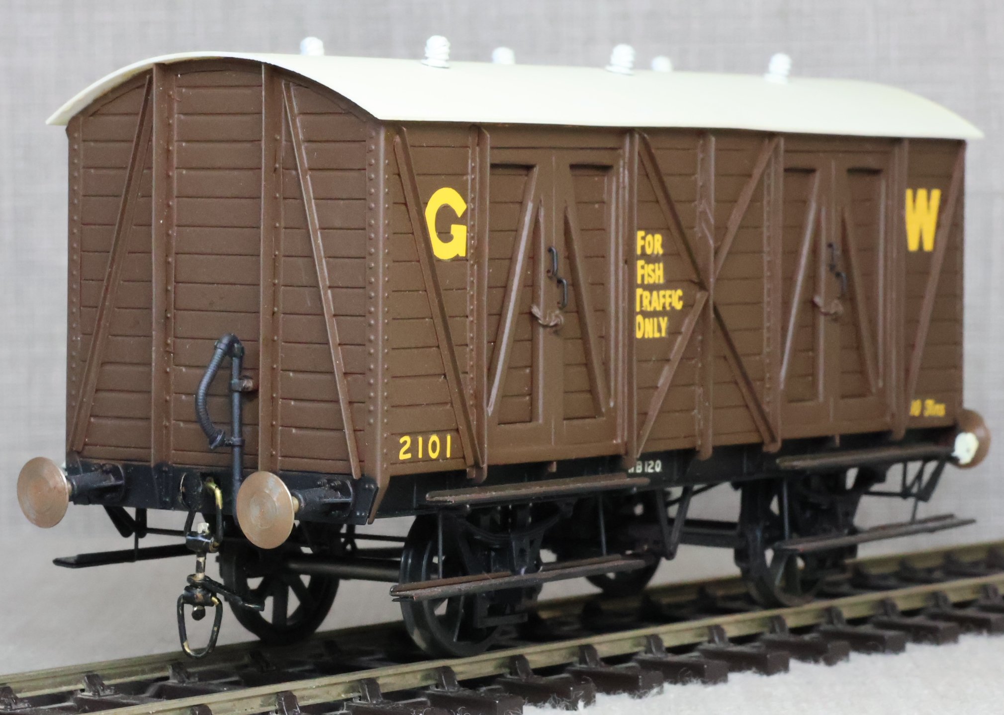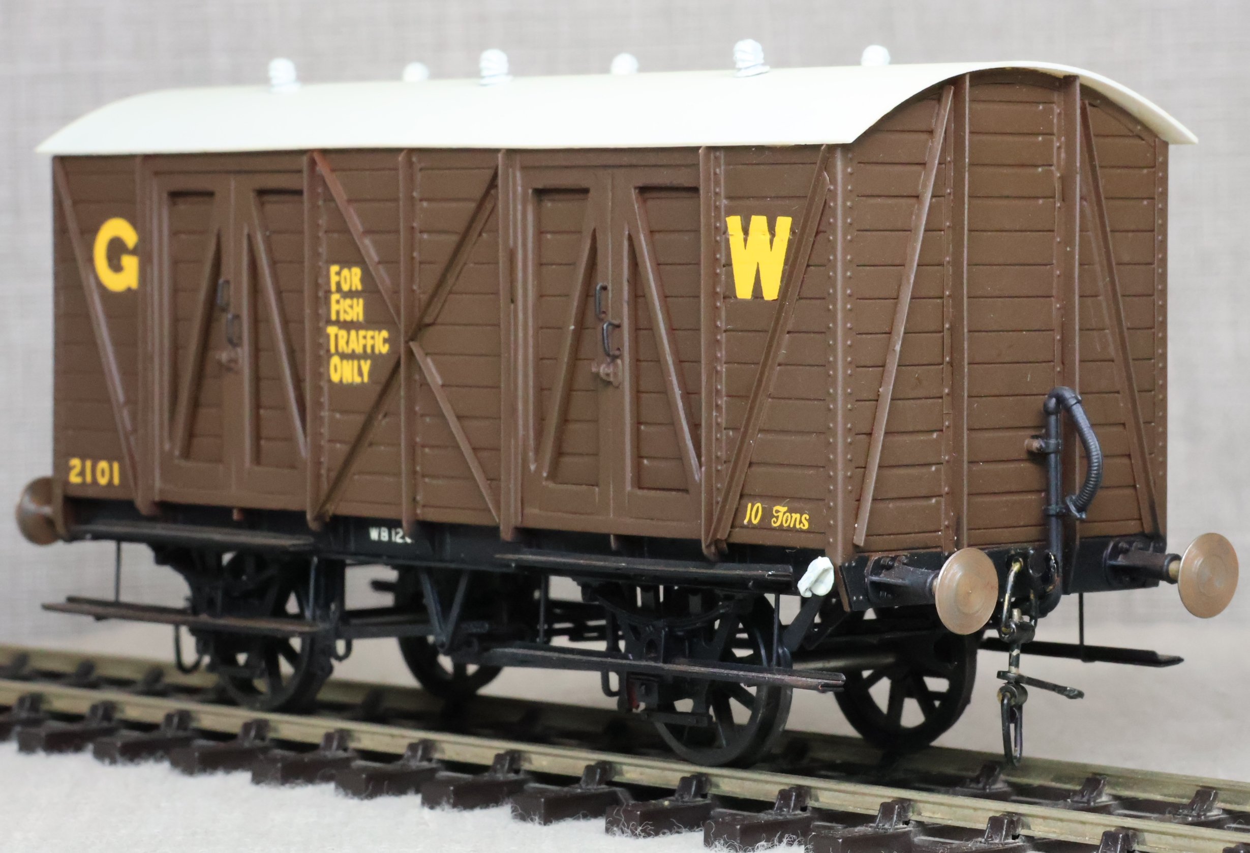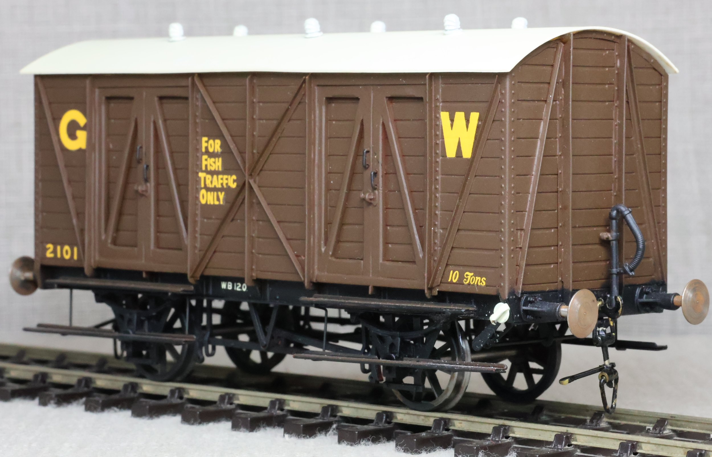 WJSW115. Great Western Railway 10 Ton Fish Van No. 2101. In GWR 1920's/1930's brown livery to Diagram S6. This is from a brass kit superbly built and painted. The model is very lightly used and has a compensation unit on one axle. It may be from a WEP kit and is similar but the usual WEP logo is not visible on the underside (it may be under the compensation unit). RESERVED.