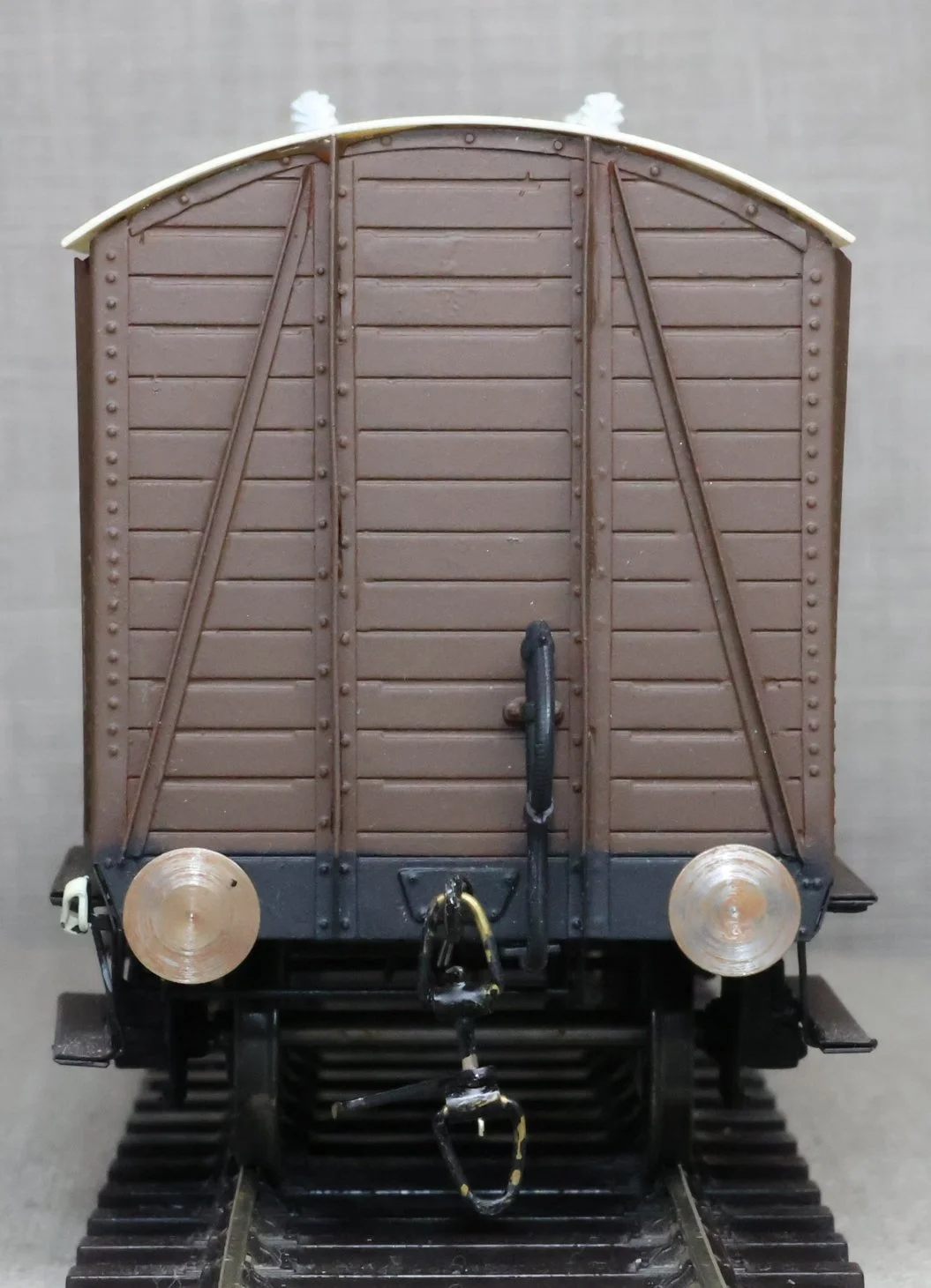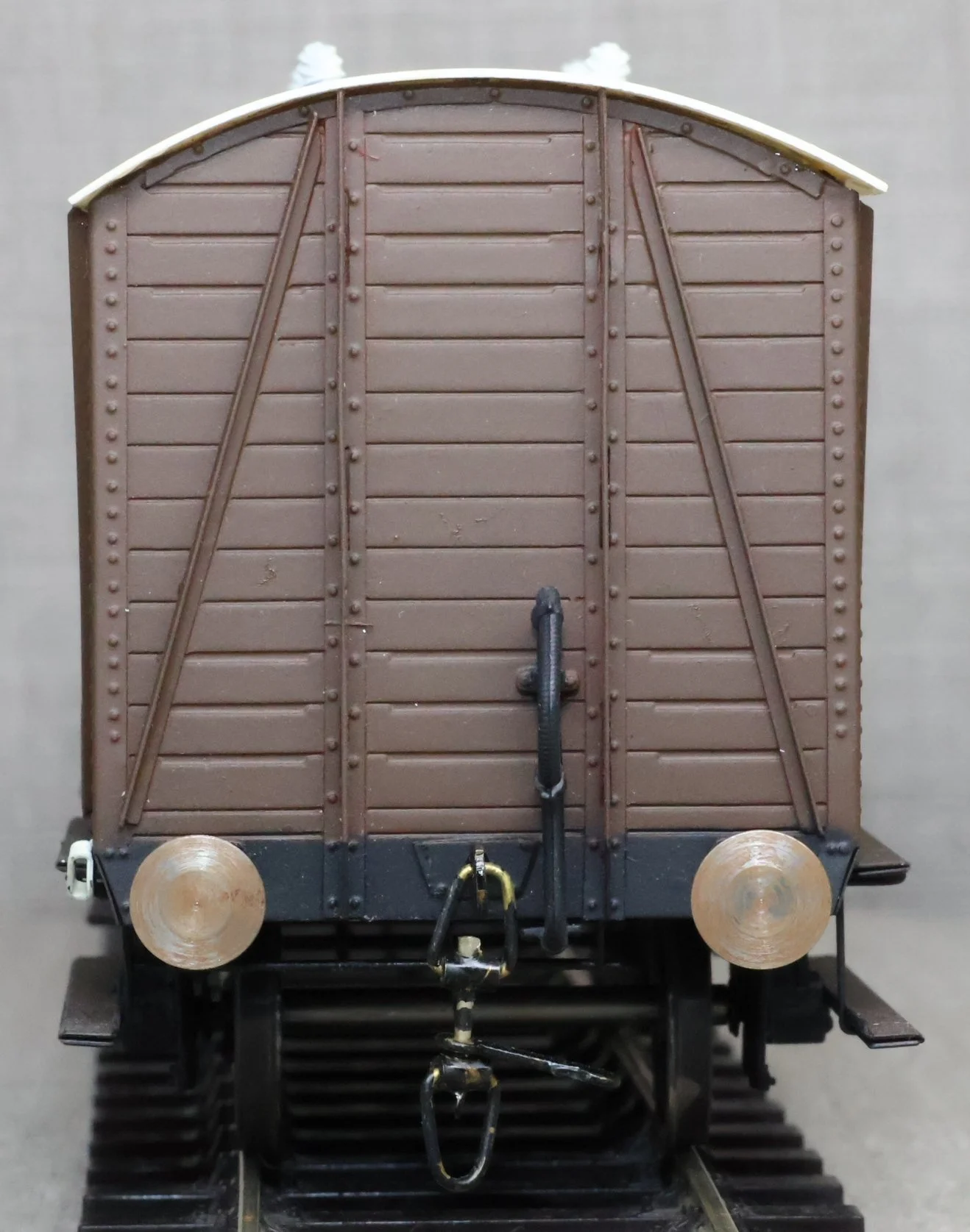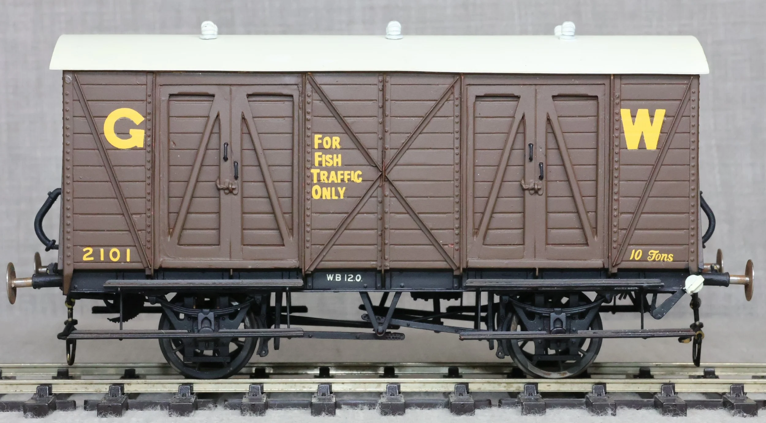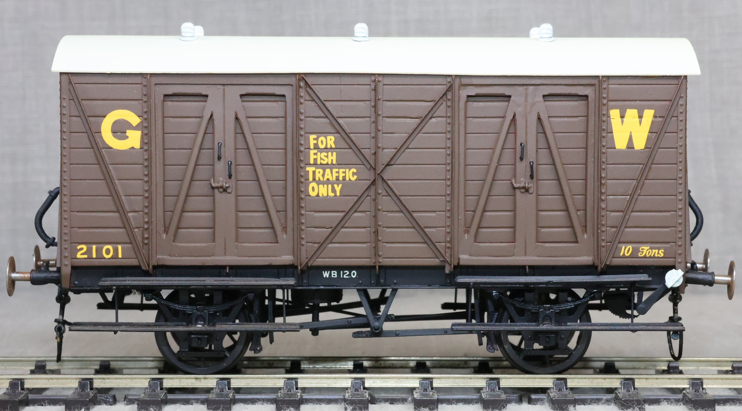 WJSW115. Great Western Railway 10 Ton Fish Van No. 2101. In GWR 1920's/1930's brown livery to Diagram S6. This is from a brass kit superbly built and painted. The model is very lightly used and has a compensation unit on one axle. It may be from a WEP kit and is similar but the usual WEP logo is not visible on the underside (it may be under the compensation unit). RESERVED.