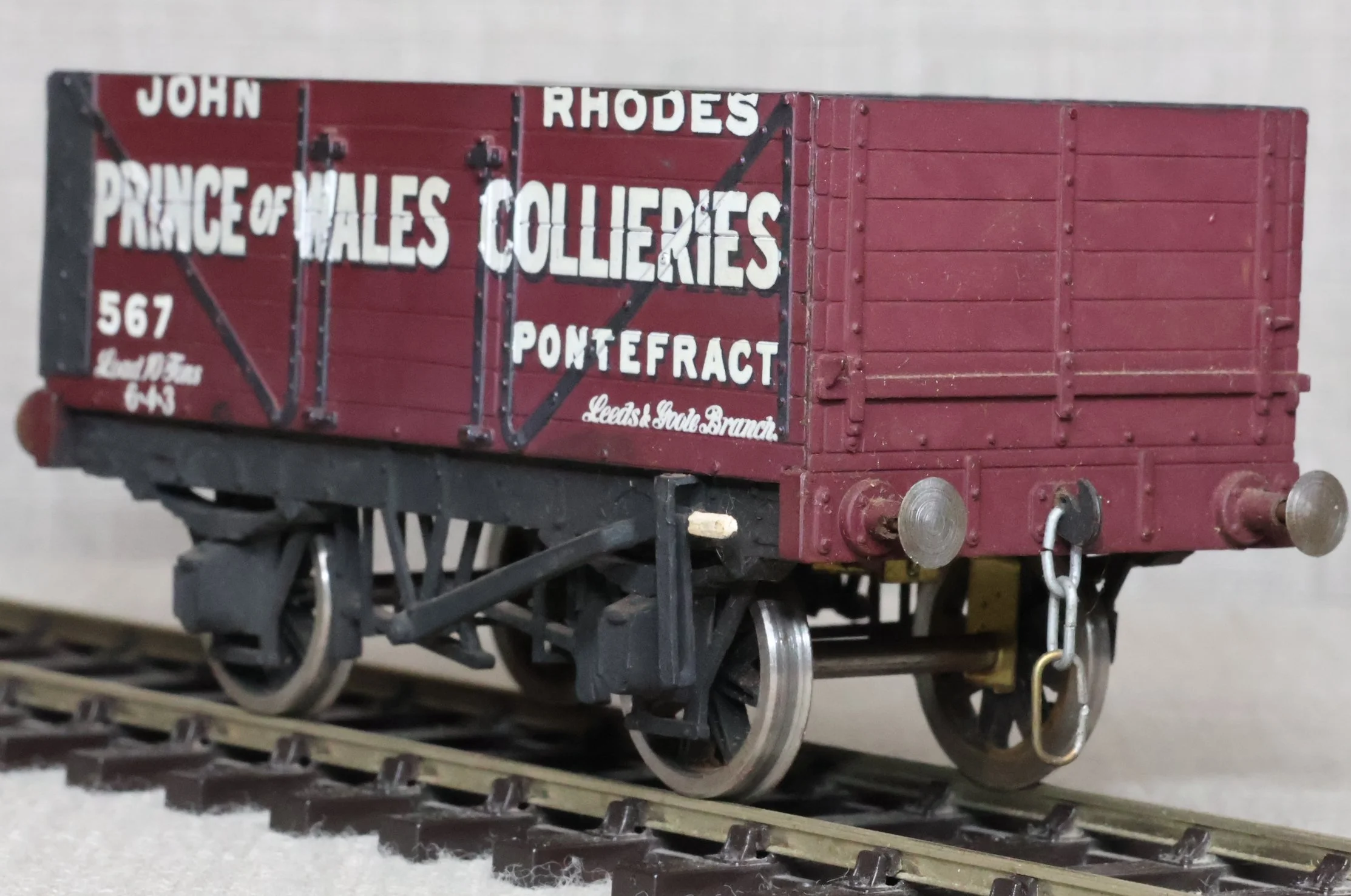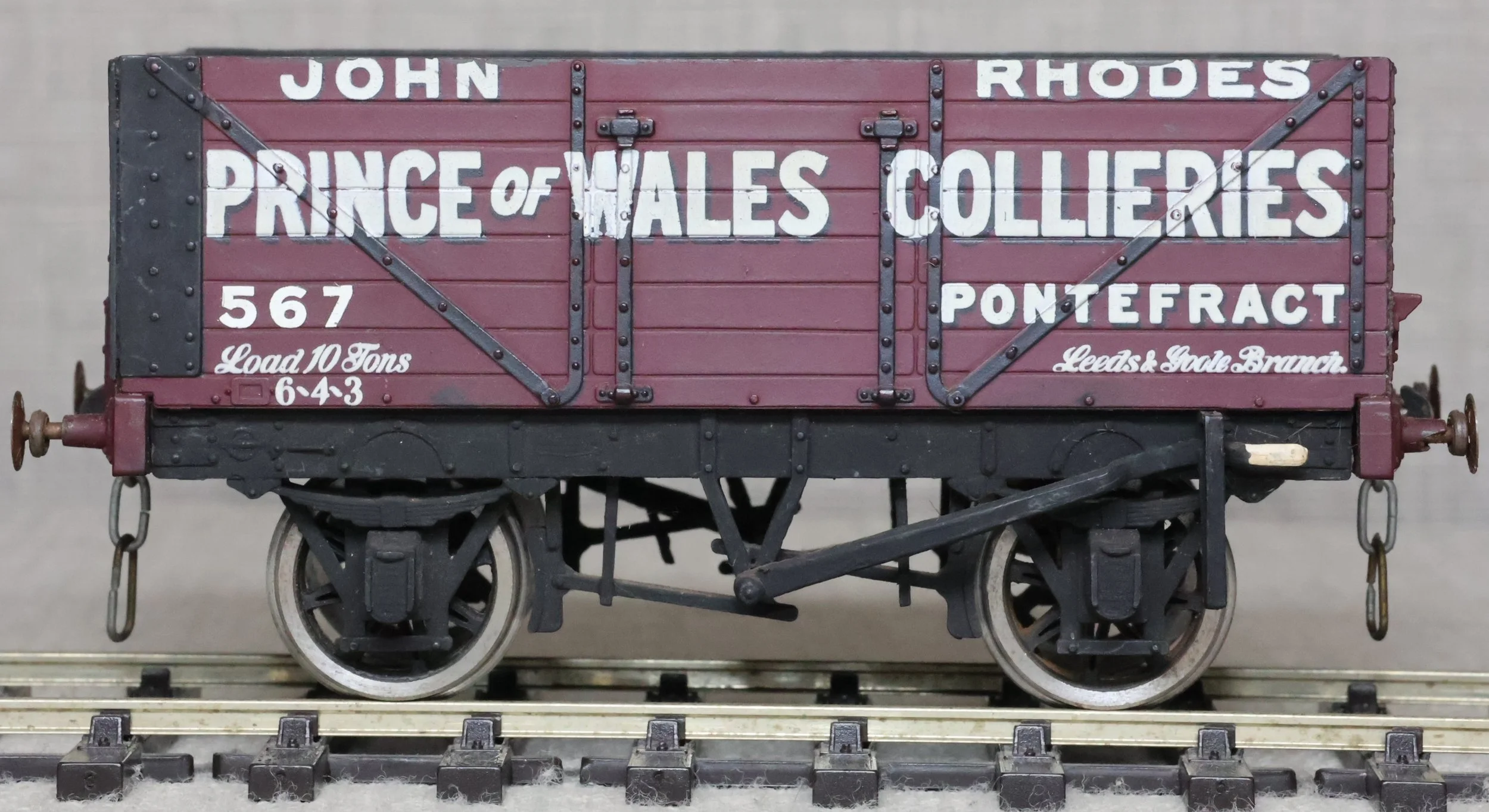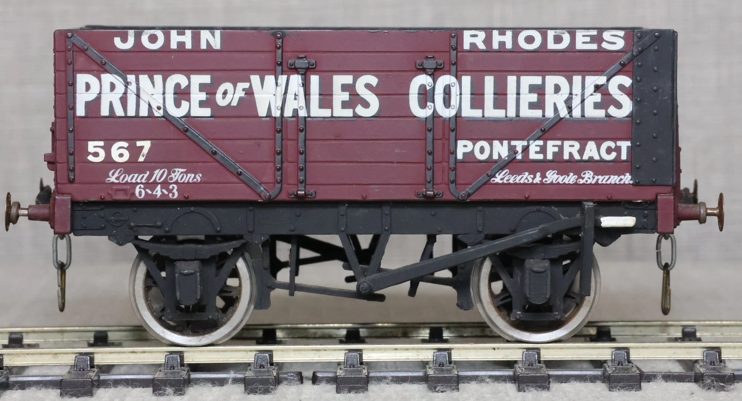 WRP108. Private Owner 10 Ton 7 Plank Loaded Coal Wagon 'Prince of Wales Collieries, Pontefract' No. 567. With a compensation unit on one axle and extra weight added. This is from a plastic kit and is lightly used. RESERVED.