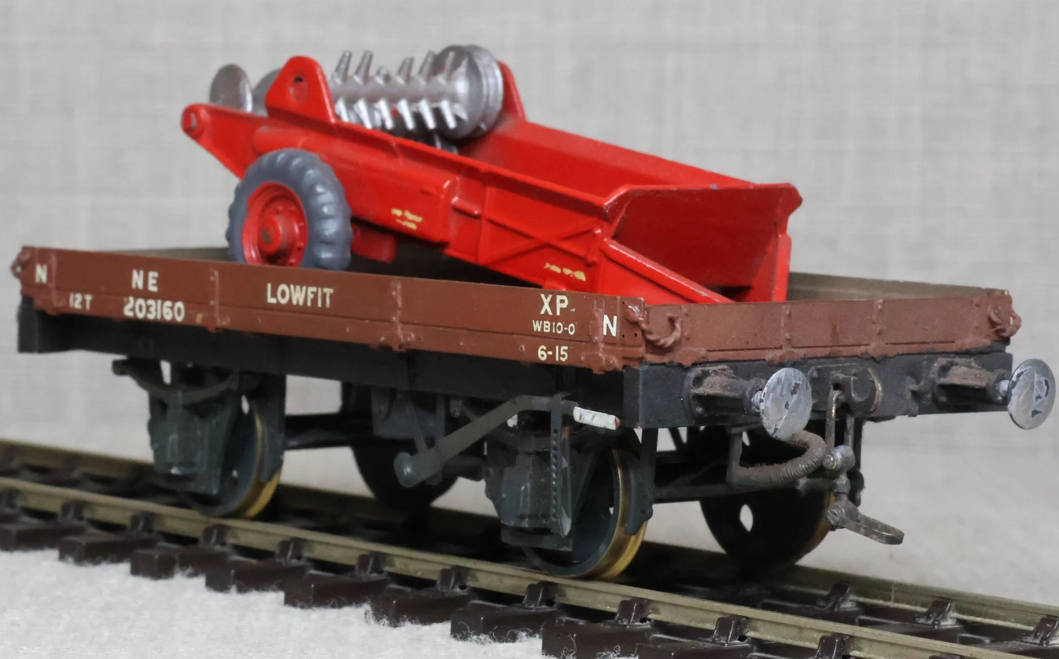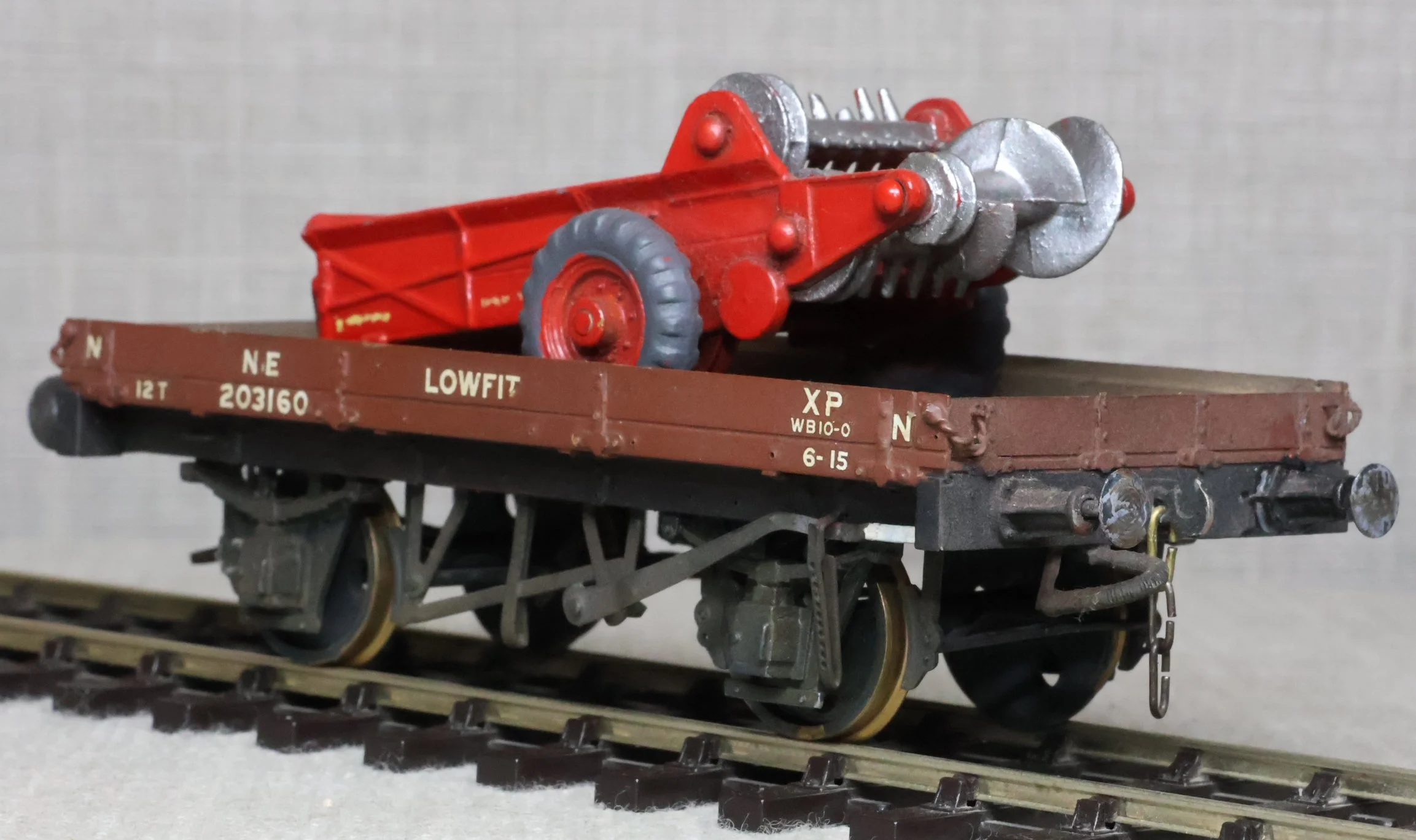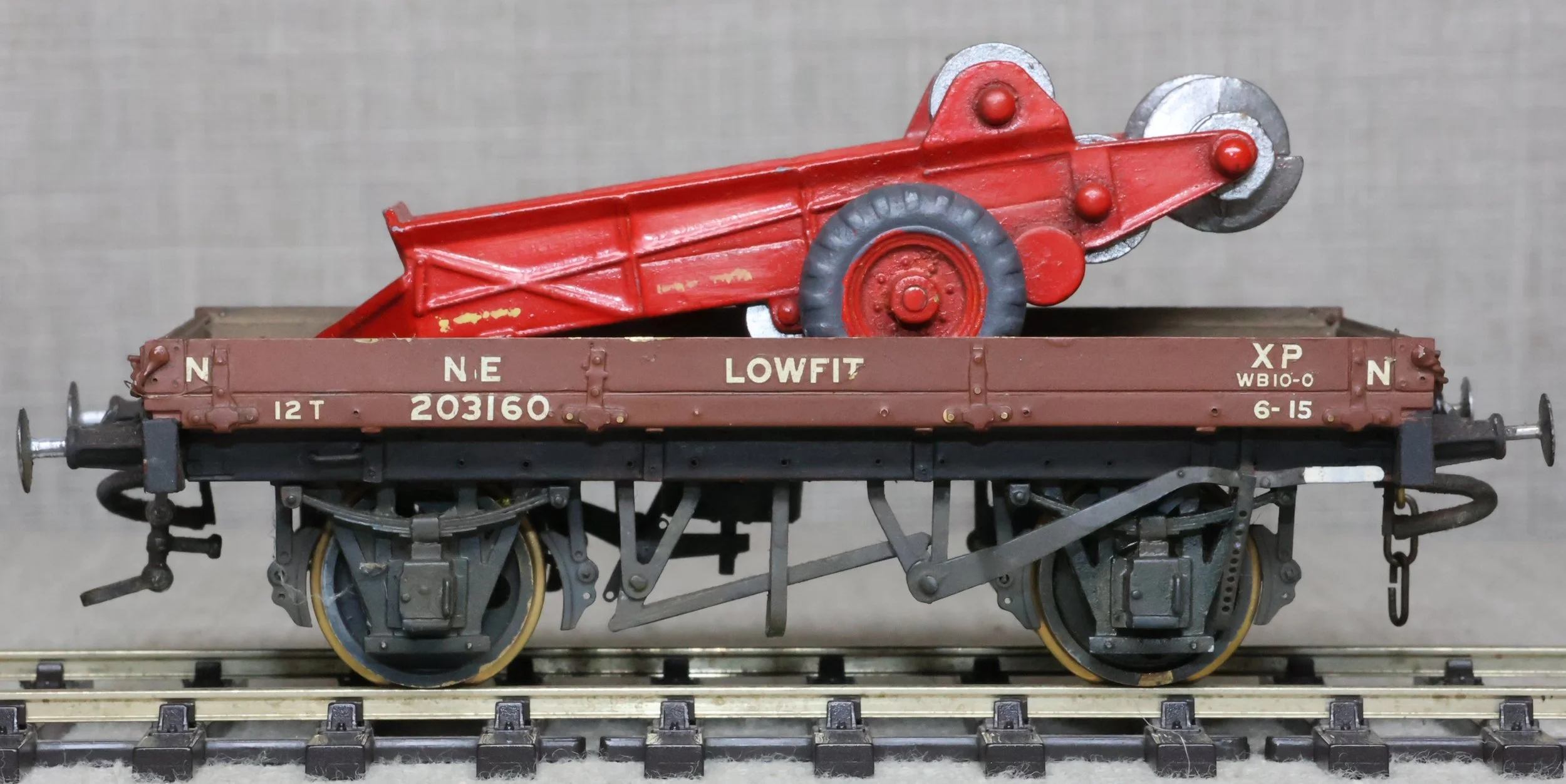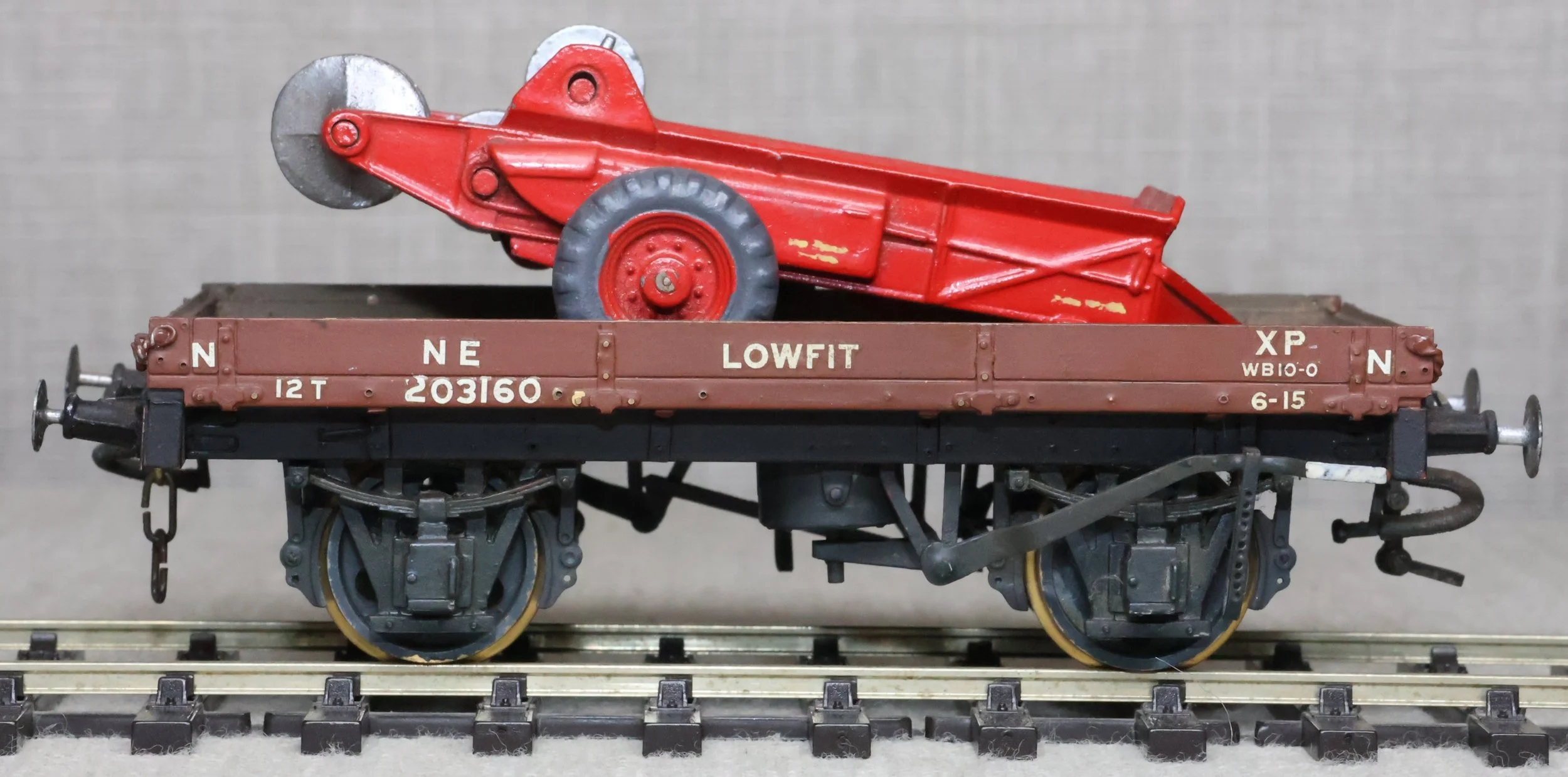 WRP44. LNER 12 Ton 'LOWFIT' Wagon No. 203160 with Manure Spreader Load. The wagon is from a whitemetal and brass kit, vacuum fitted, with one screw coupling and one 3-link coupling. This is a used model and is carrying a Dinky Toys Massey Harris manure spreader. RESERVED.