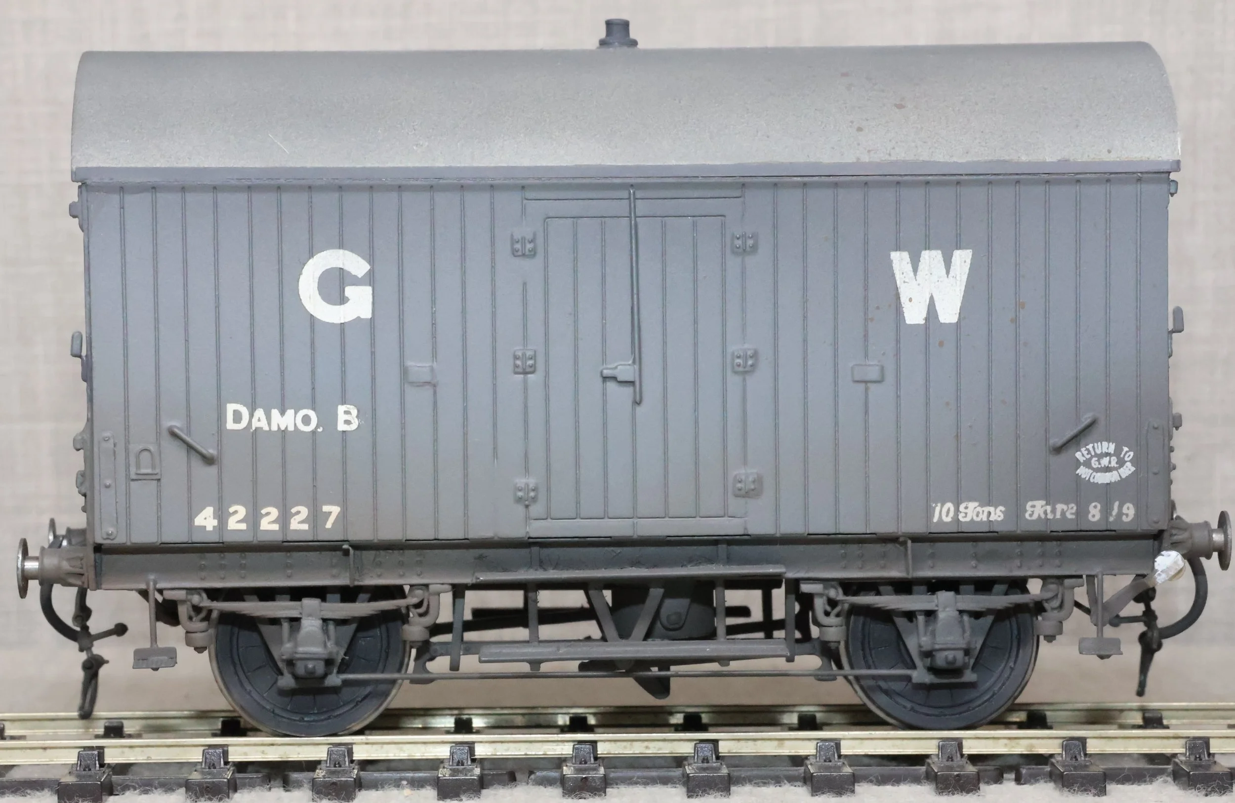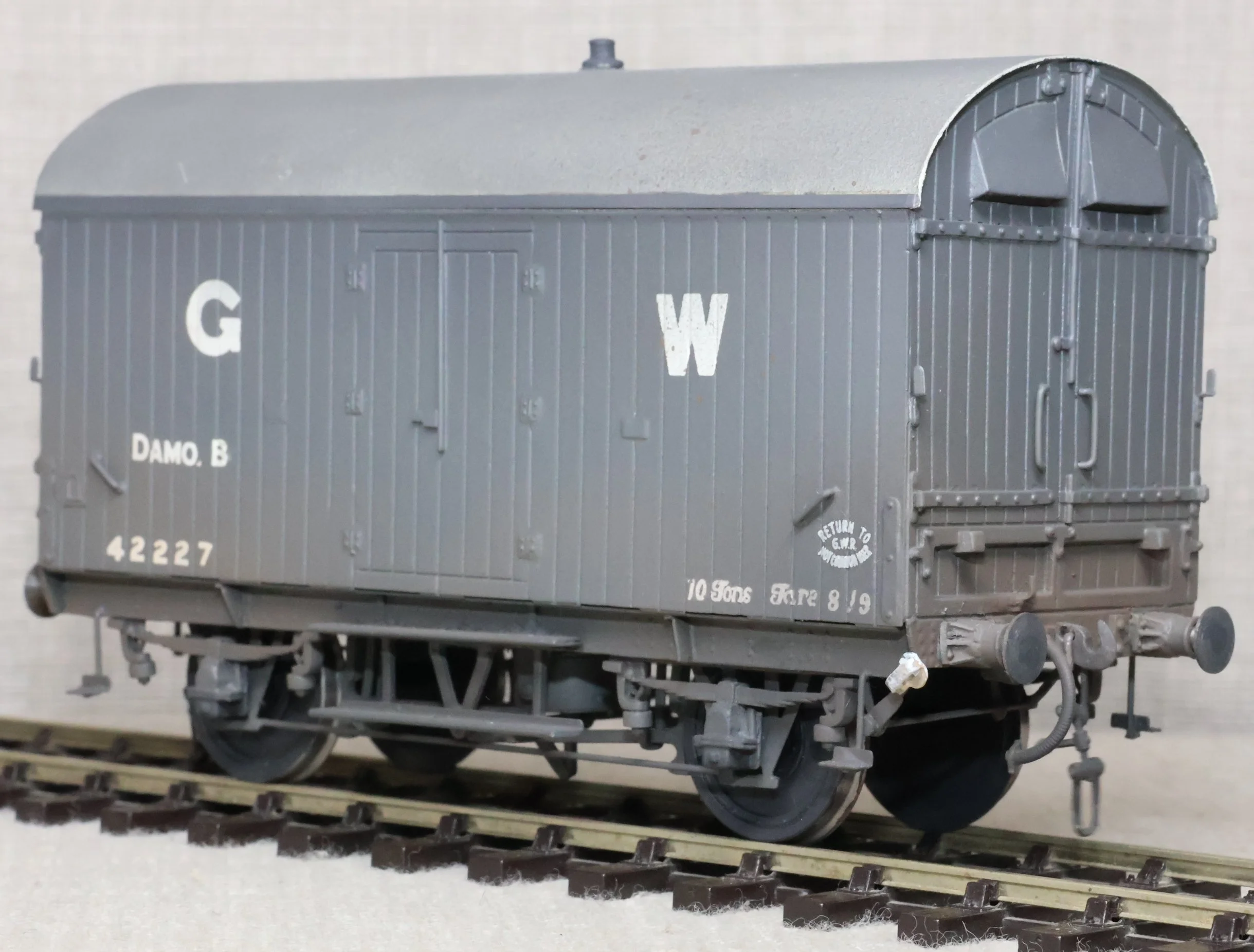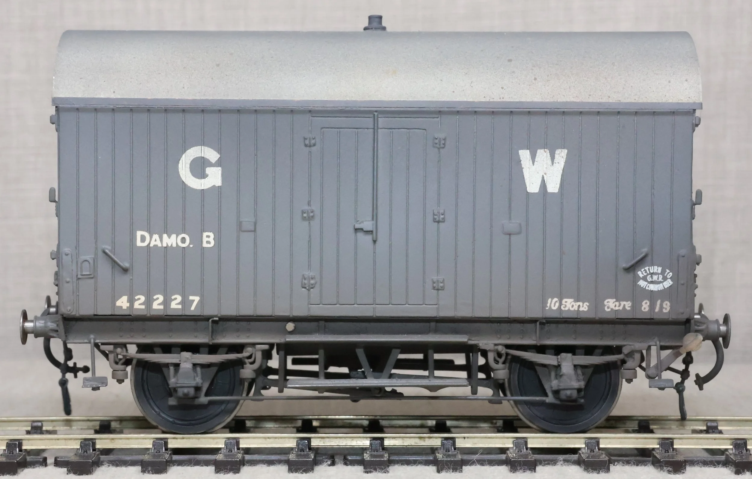 WTSH03. GWR 20ft 10 Ton 'DAMO B' Covered Motor Car Van No. 42227. Also known as a 'Covered Carriage Truck' or 'CCT'. In GWR freight grey livery, lightly weathered. To GWR Diagram G25 as introduced in 1925. This is very well built and painted from a DJB Engineering brass kit with a compensation unit on one axle. The model is very lightly used. The prototypes were designed to carry a single motor car loaded via end doors. £150.