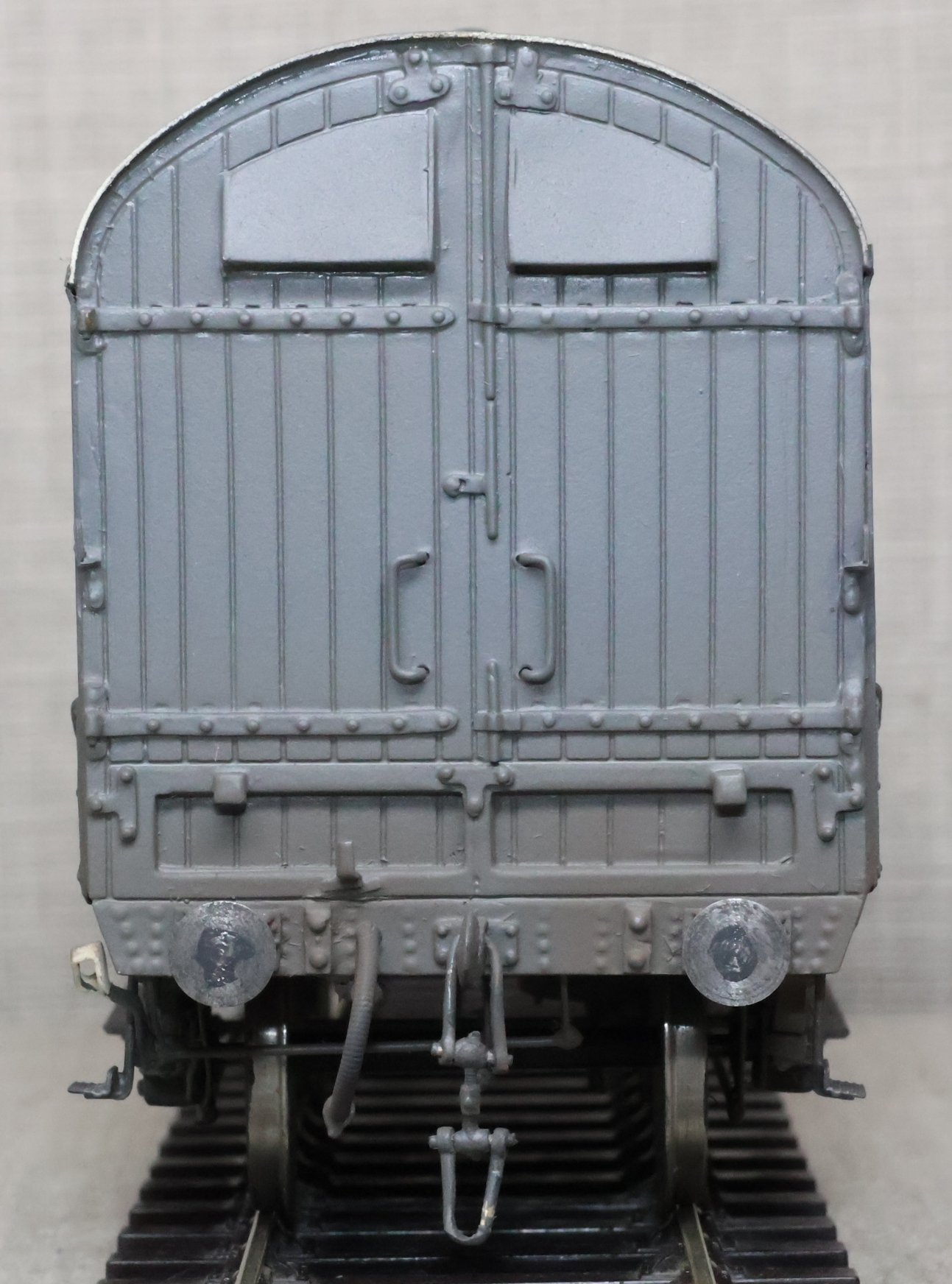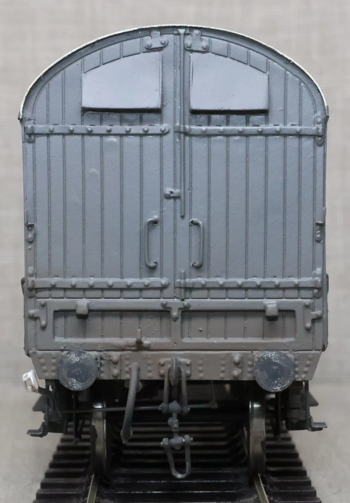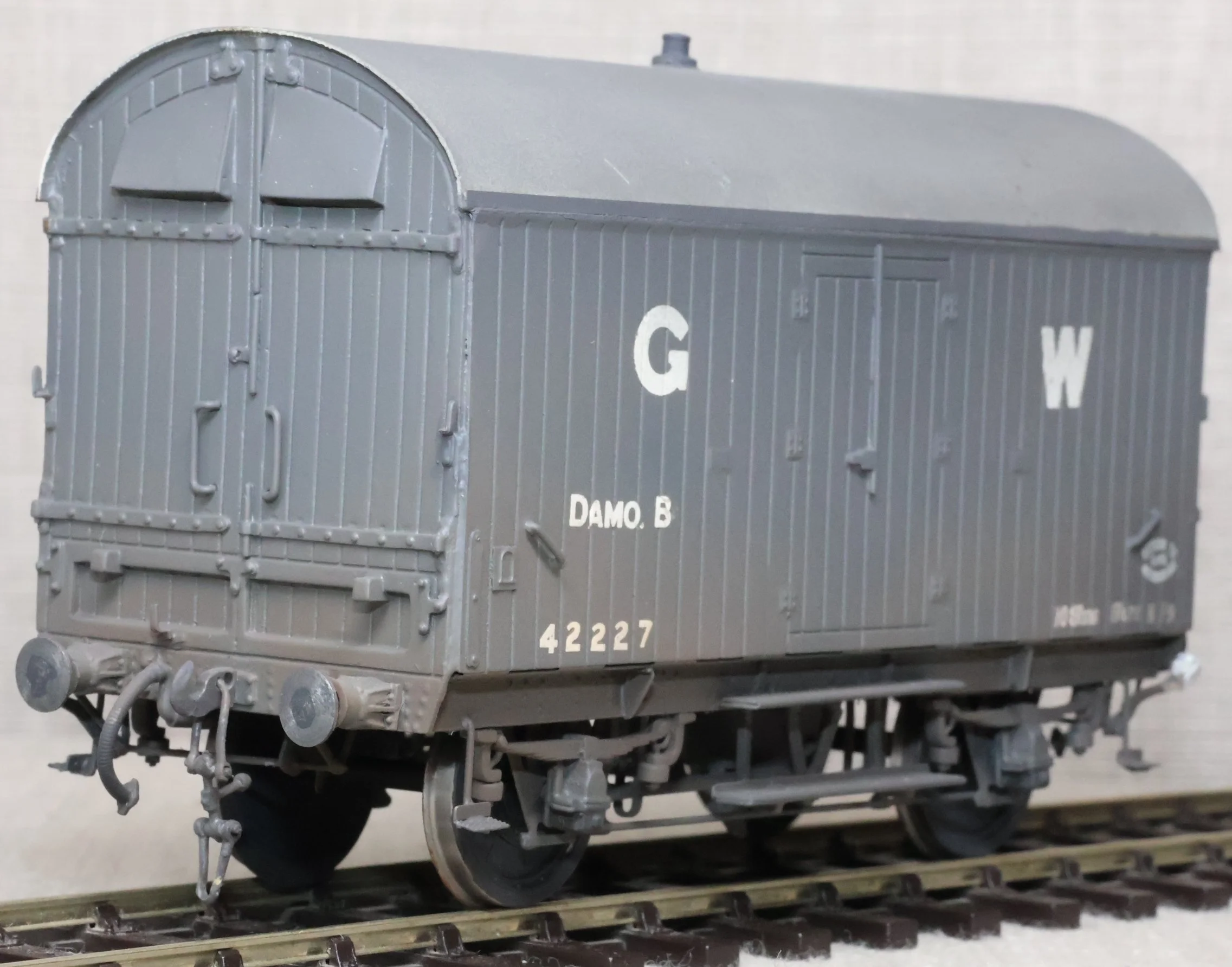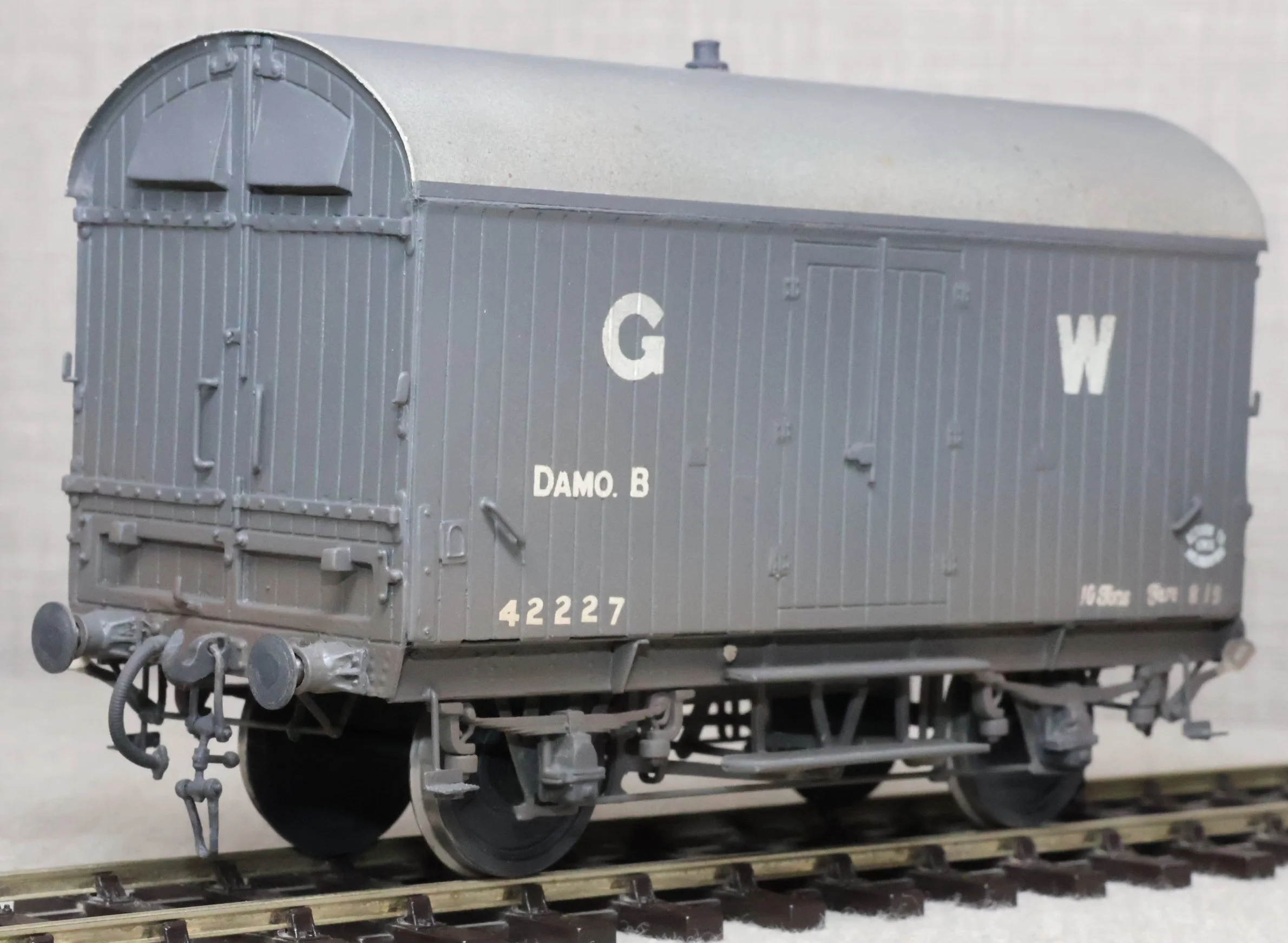 WTSH03. GWR 20ft 10 Ton 'DAMO B' Covered Motor Car Van No. 42227. Also known as a 'Covered Carriage Truck' or 'CCT'. In GWR freight grey livery, lightly weathered. To GWR Diagram G25 as introduced in 1925. This is very well built and painted from a DJB Engineering brass kit with a compensation unit on one axle. The model is very lightly used. The prototypes were designed to carry a single motor car loaded via end doors. £150.